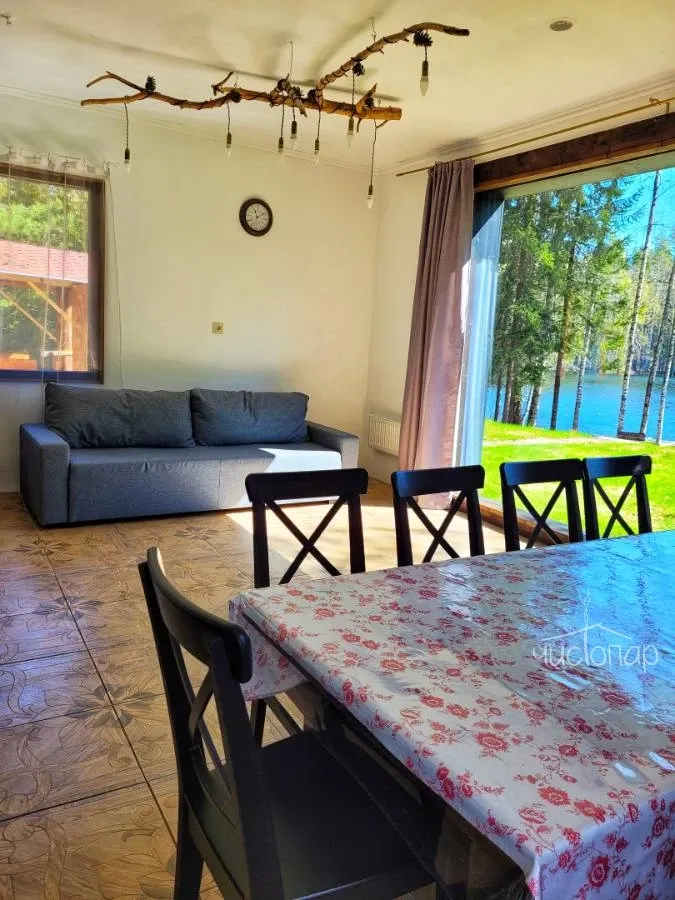 В гостиной комфортный диван с 2 дополнительными полноценными спальными местами. Панорамные окна с видом на озеро.