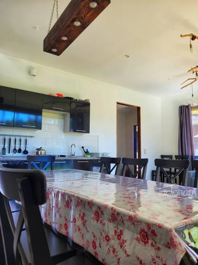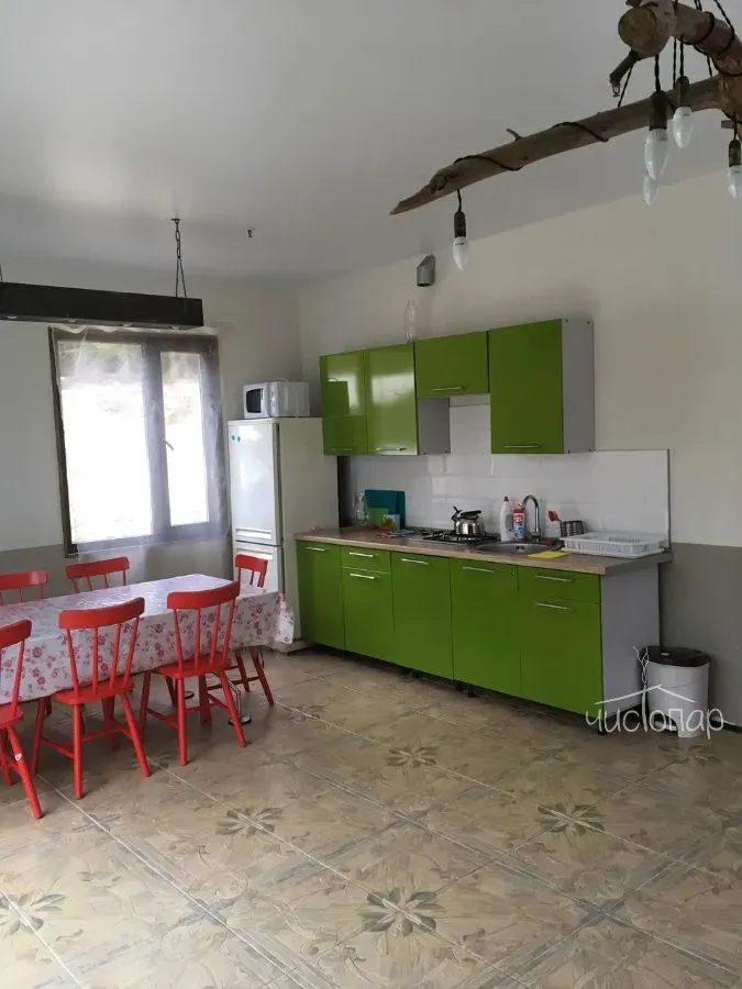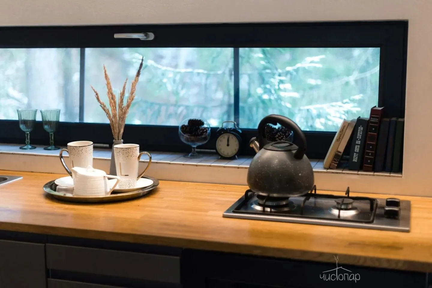 Внутри полностью оборудованная кухня с плитой, чайником, микроволновкой, холодильником. В наличии есть вся необходимая посуда - тарелки, стаканы, бокалы, фужеры, сковородки, кастрюли, столовые приборы.