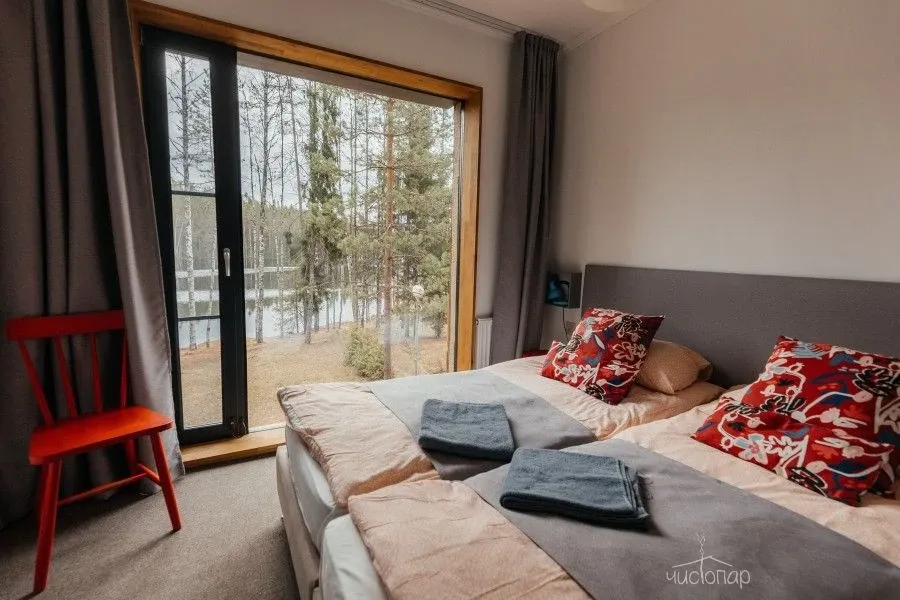 Дом для отдыха с пятью отдельными спальными комнатами, двумя санузлами и большой кухней-гостиной с видом на озеро и Карельский лес готов принять гостей по системе 10+4 (10 гостей размещаются на основных местах в спальных комнатах, 2 дополнительных места оборудованы в просторной гостиной и 2 места будут предоставлены в спальных комнатах второго этажа - раскладная кровать и кресло-кровать). В каждой спальной комнате кровати спринг-боксы, прикроватные тумбы, шкаф для одежды, зеркало, шторы blackout, москитная сетка в летний сезон. В двух спальных комнатах второго этажа панорамный вид на озеро. Постельное белье и полотенца предоставляются. Детская кроватка и стульчик для кормления бесплатно по предварительному запросу. Коттедж включает в себя полностью оборудованную кухню с плитой, чайником, микроволновкой, холодильником. В наличии есть вся необходимая посуда - тарелки, стаканы, бокалы, фужеры, сковородки, кастрюли, столовые приборы. Обеденный стол для большой компании.