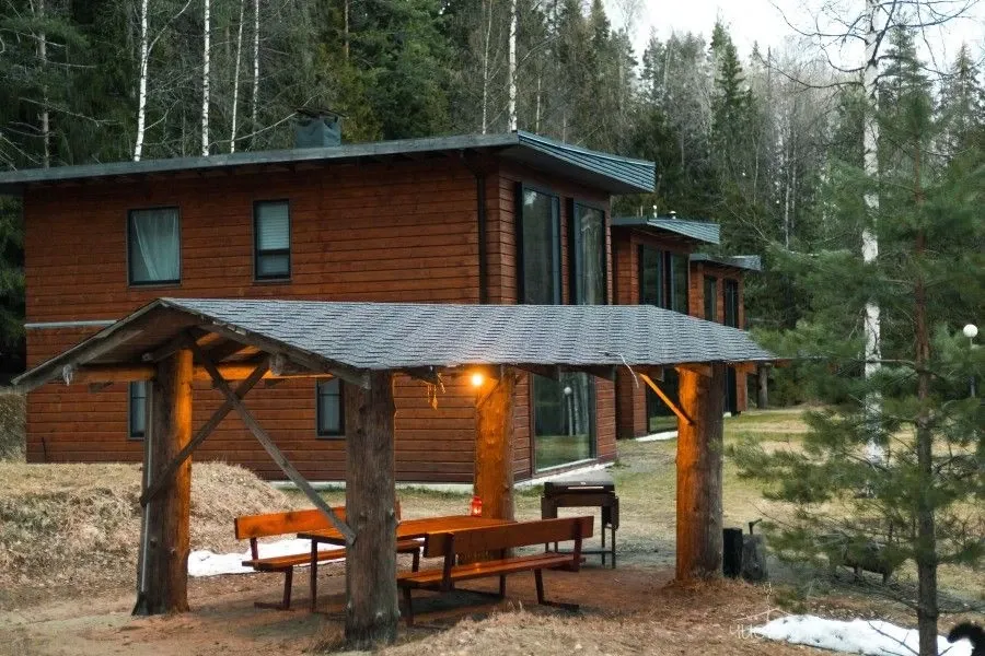 У коттеджа своя крытая патио зона, оборудованная освещением, столом, скамейками, мангалом.