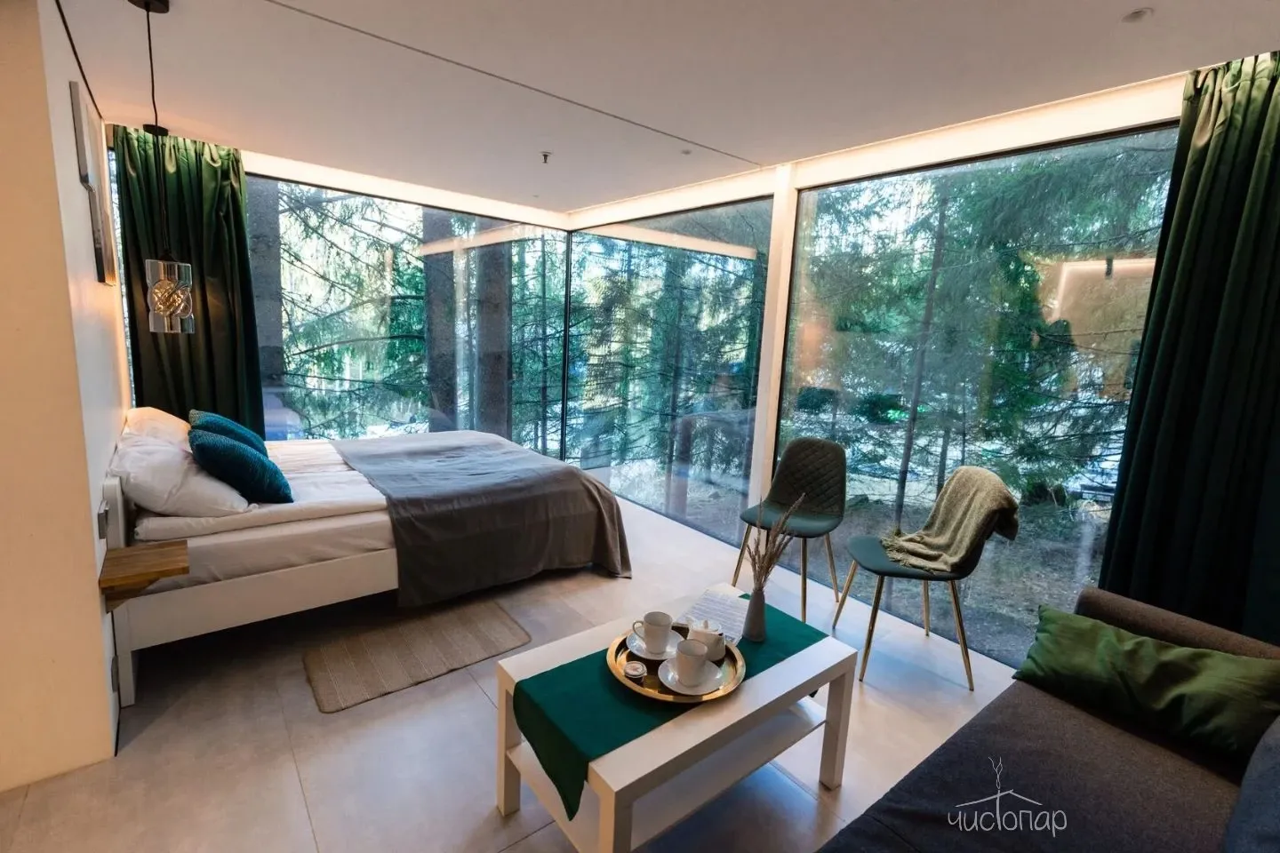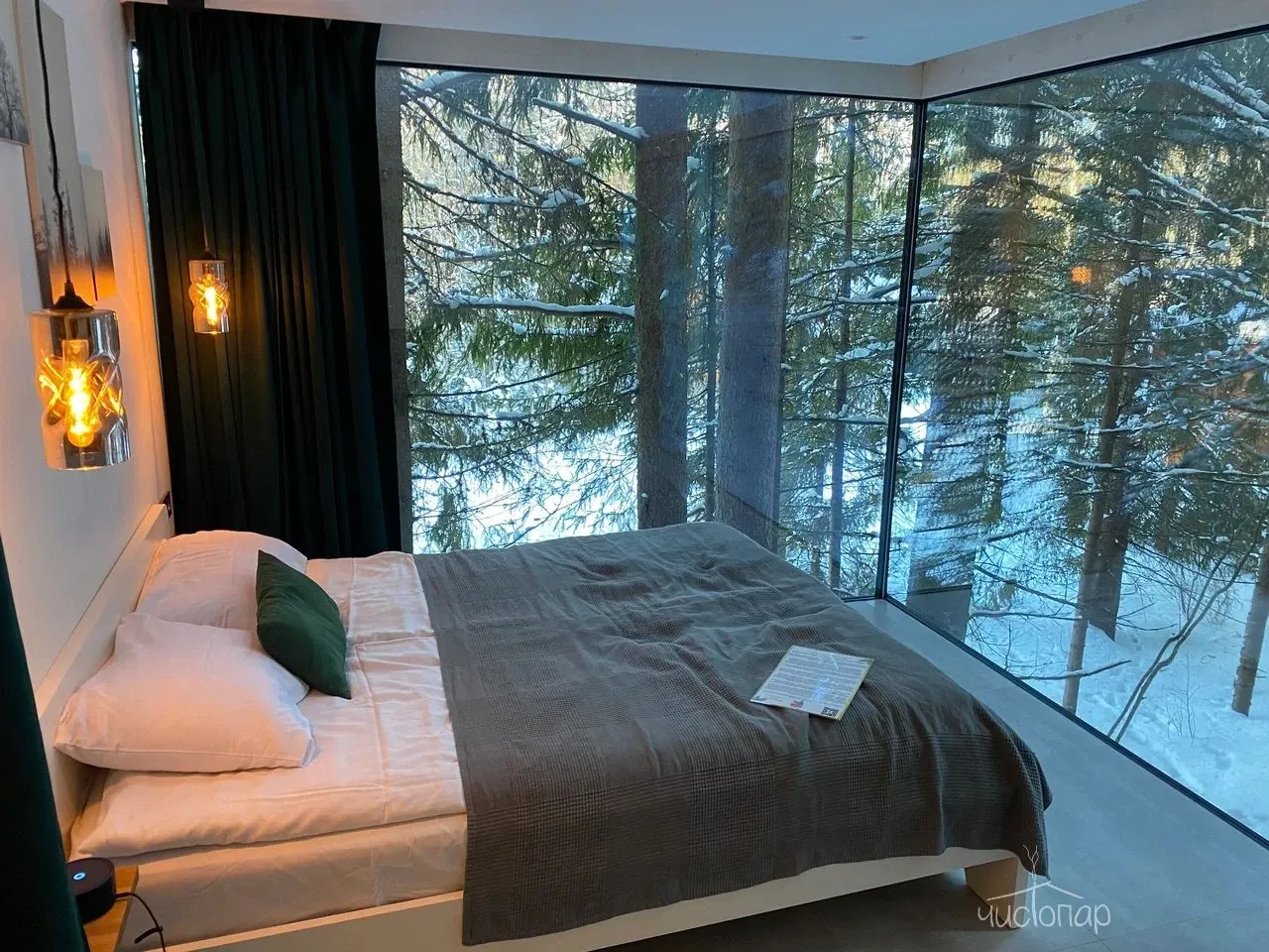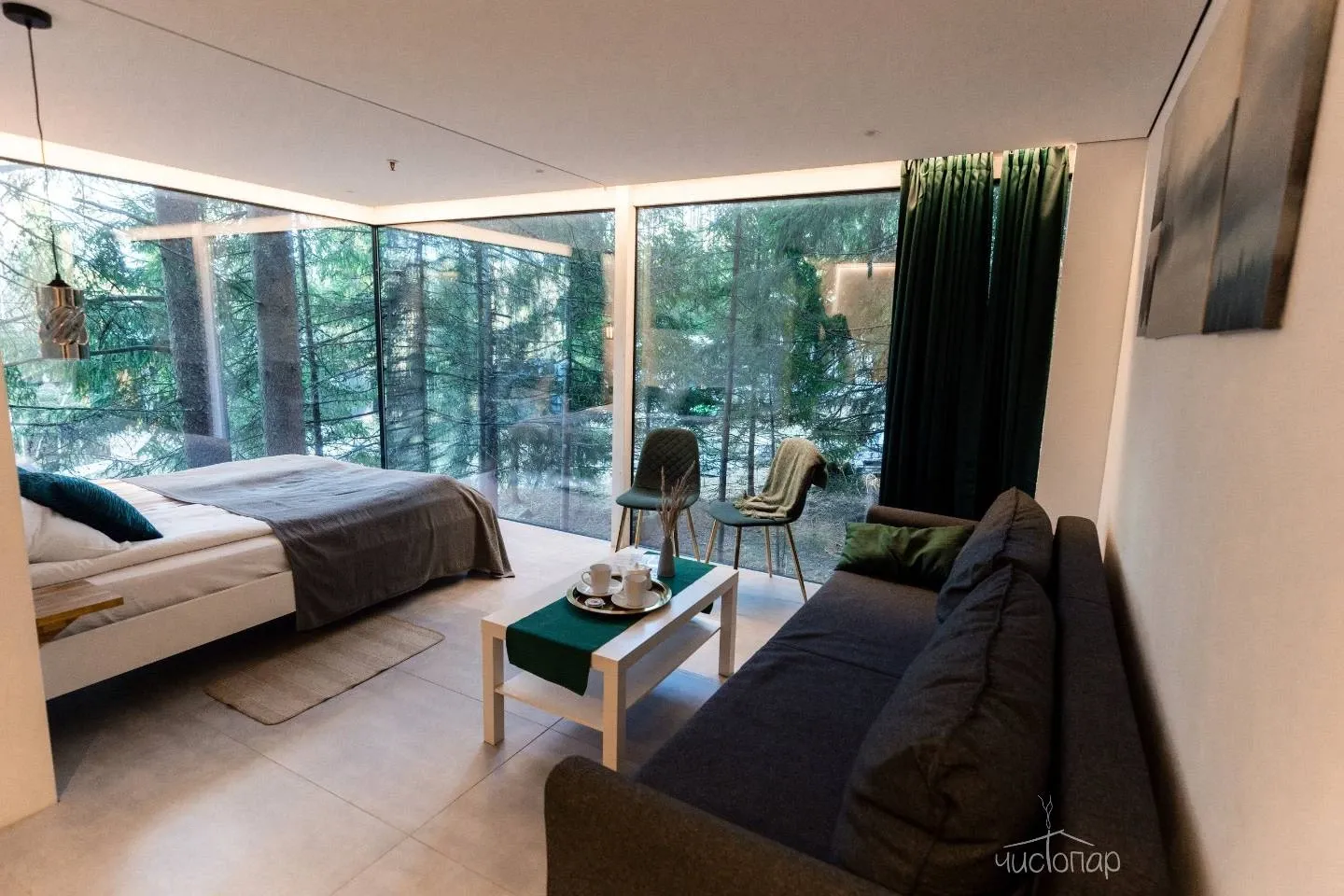 Современный Дом для отдыха комфорт класса с дизайнерским подходом и панорамным видом на лес, находится на возвышенности в окружении сосен, что создаёт ощущение полёта и уединённости. На окнах плотные шторы blackout. Коттедж представляет собой единое пространство: кухня-спальня-гостиная, принимает гостей по системе 2+2. Ориентирован исключительно на семейный отдых и идеально подойдет для одной семьи: родители и дети (кровать отделяется от дивана плотной шторой). Детская кроватка и стульчик для кормления бесплатно по предварительному запросу.