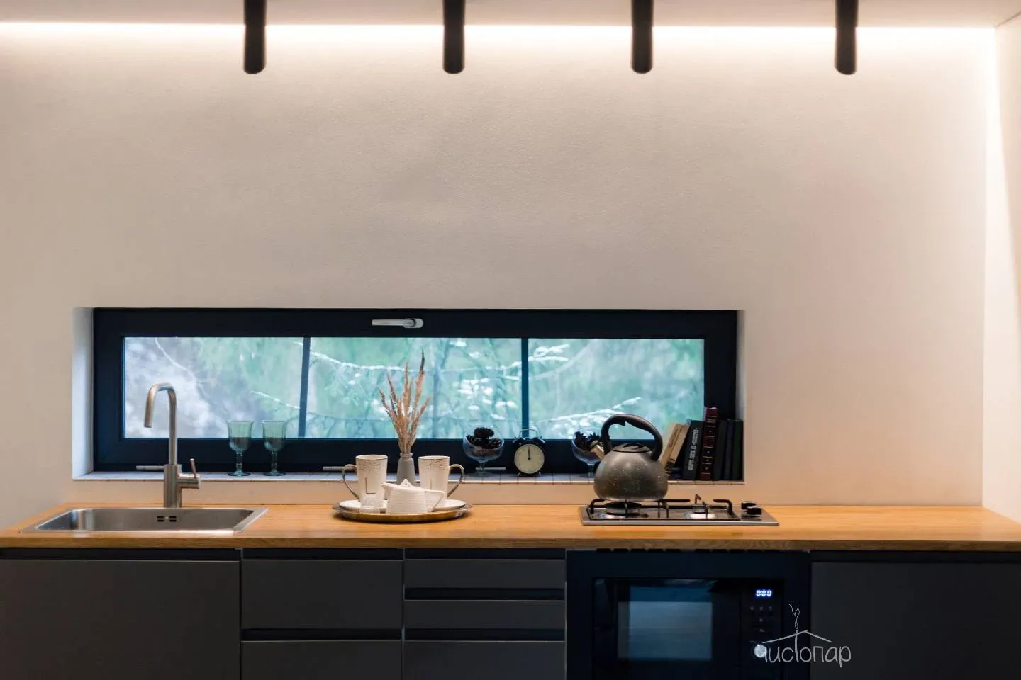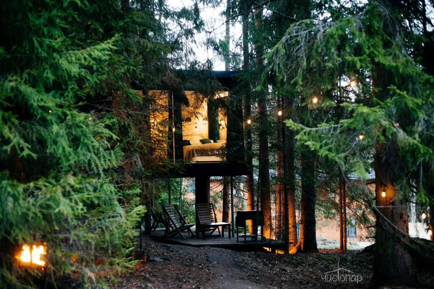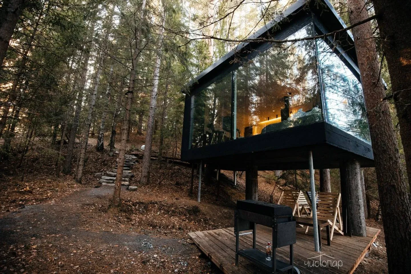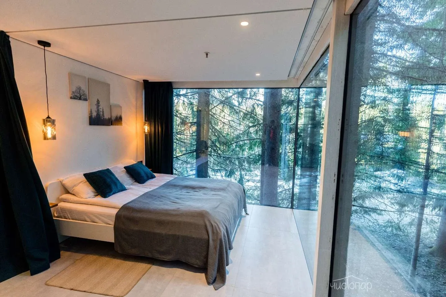 Современный Дом для отдыха комфорт класса с дизайнерским подходом и панорамным видом на лес, находится на возвышенности в окружении сосен, что создаёт ощущение полёта и уединённости. На окнах плотные шторы blackout. Коттедж представляет собой единое пространство: кухня-спальня-гостиная, принимает гостей по системе 2+2. Ориентирован исключительно на семейный отдых и идеально подойдет для одной семьи: родители и дети (кровать отделяется от дивана плотной шторой). Детская кроватка и стульчик для кормления бесплатно по предварительному запросу.