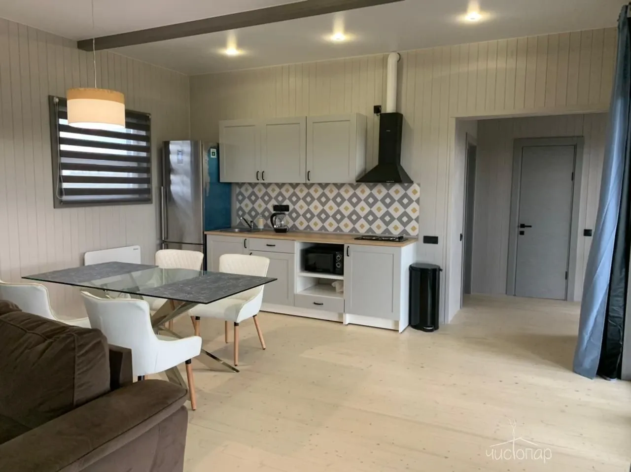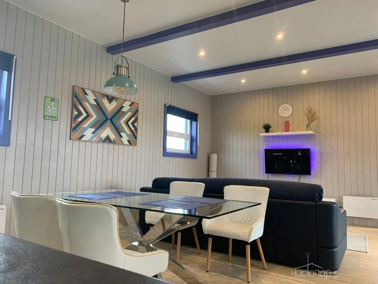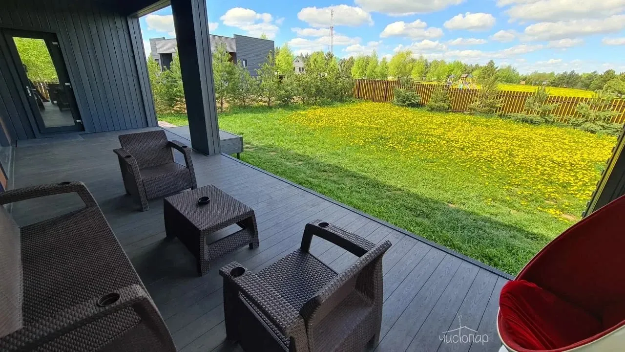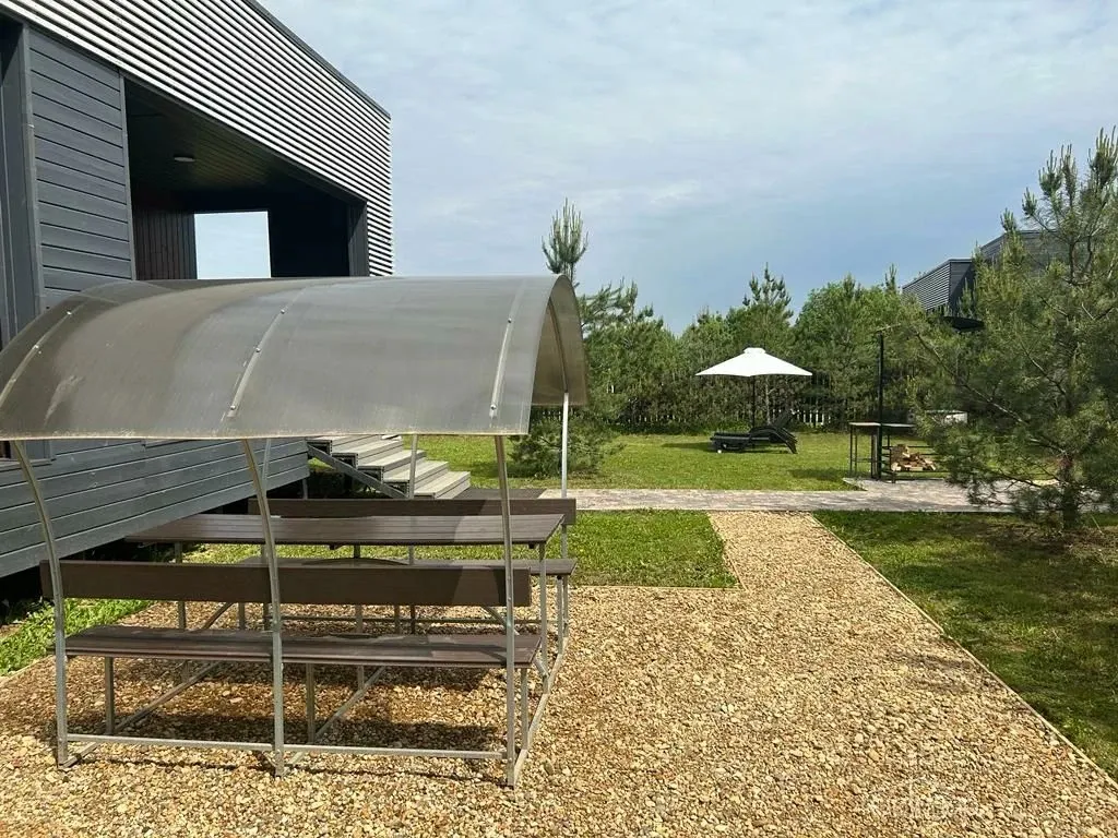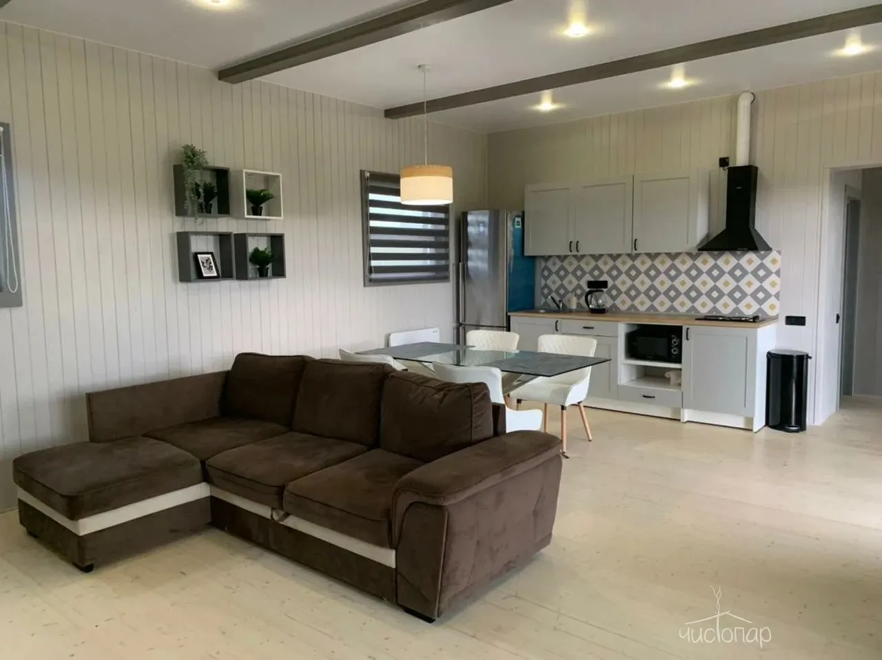 В доме 3 спальни с двуспальной кроватью и большая гостиная (раскладной диван) совмещенная с кухней. На кухне размещен большой стол со стульями. Есть вся необходимая бытовая техника. В доме есть финская сауна (баня).