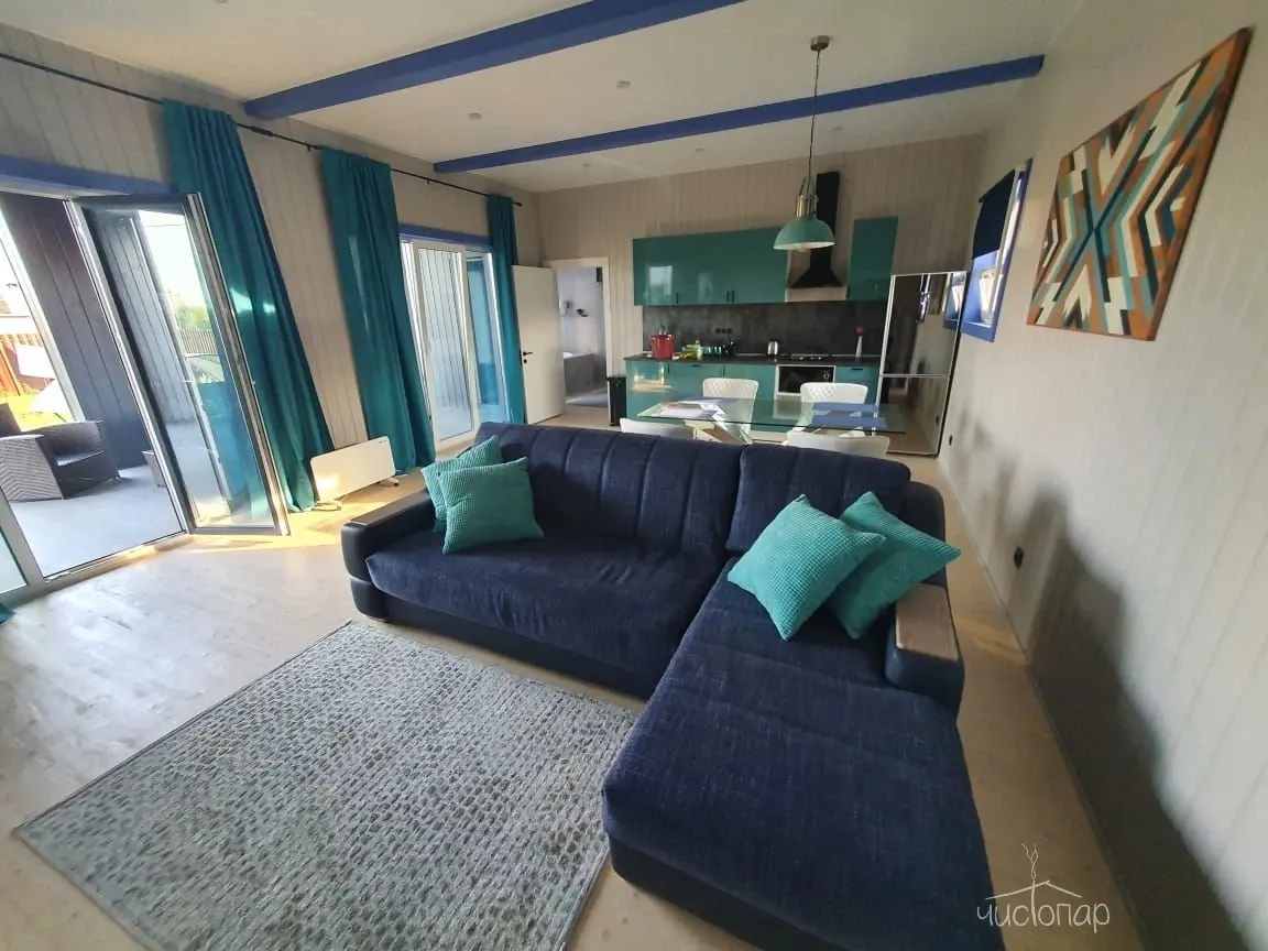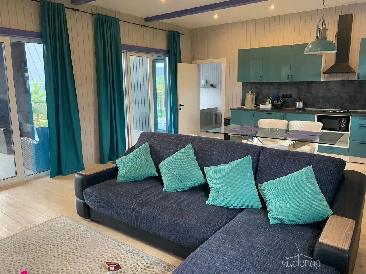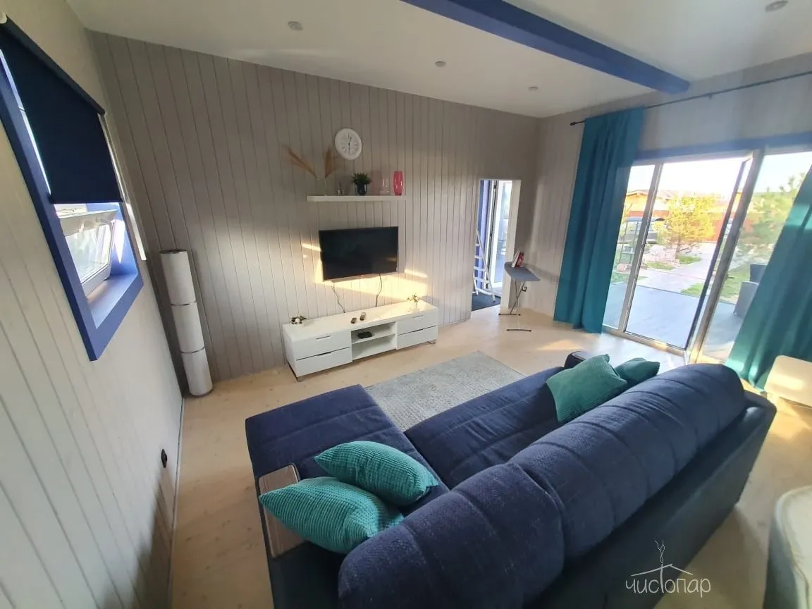 В доме 3 спальни с двуспальной кроватью и большая гостиная совмещенная с кухней. На кухне размещен большой стол со стульями. Есть вся необходимая бытовая техника, даже машинка для сушки белья. В доме есть финская сауна.