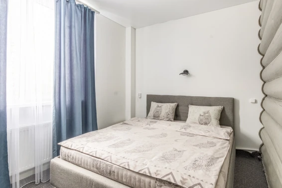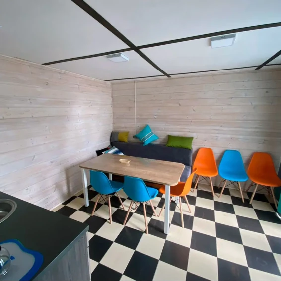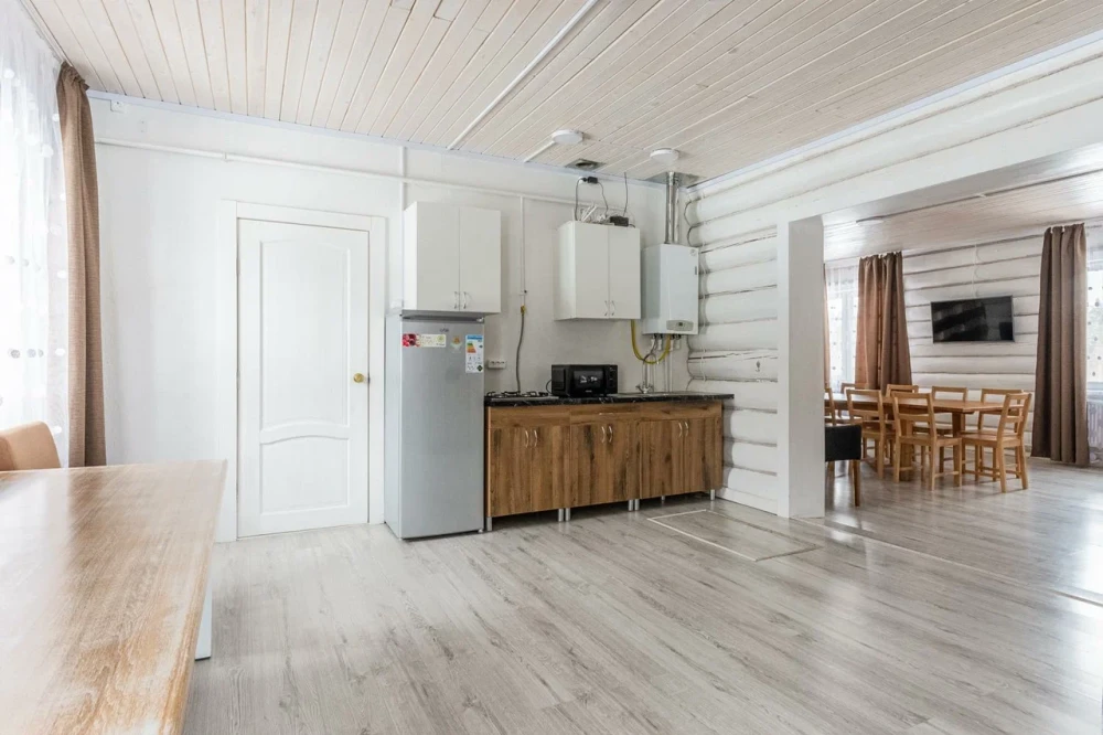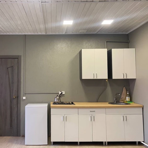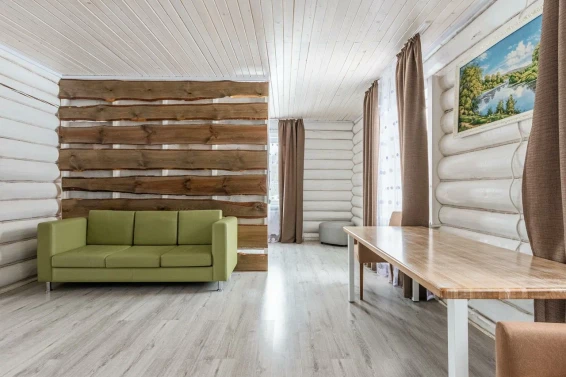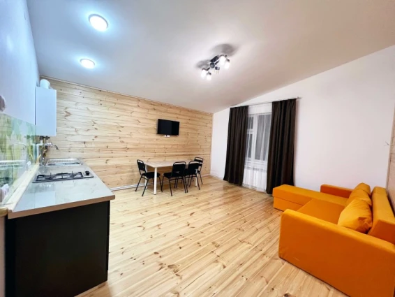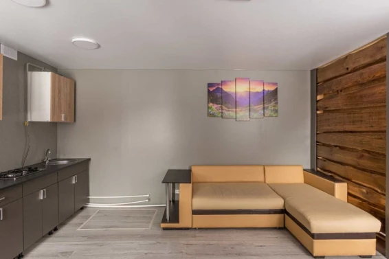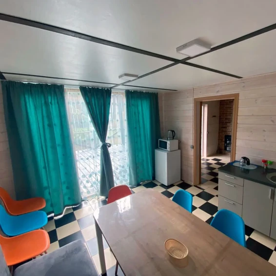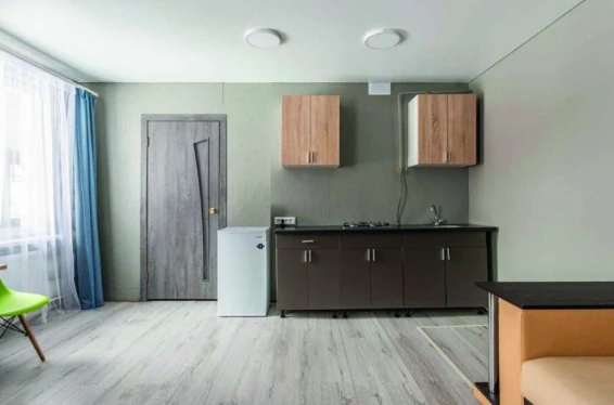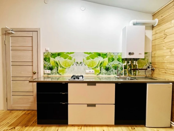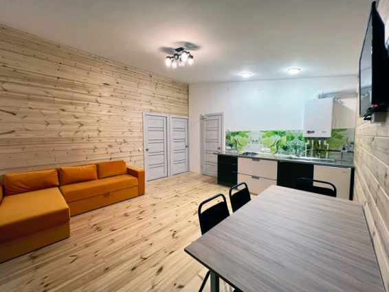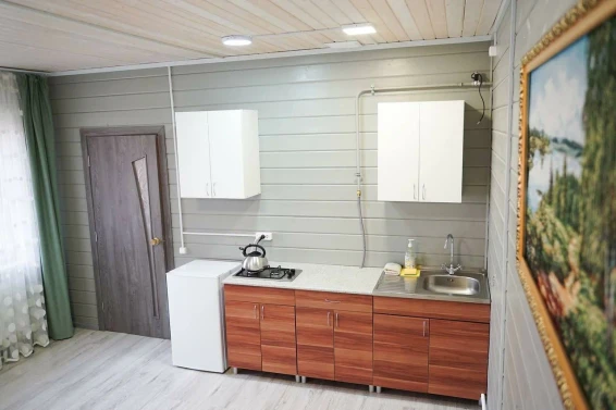 Номер состоит из двух комнат: общая зона для отдыха, кухня и отдельная комната. Мини-кухня в номере укомплектована всем необходимым: газовой плитой, холодильником, чайником, посудой и кухонными принадлежностями. В номере имеются две двуспальные кровати и диван для комфортного сна.