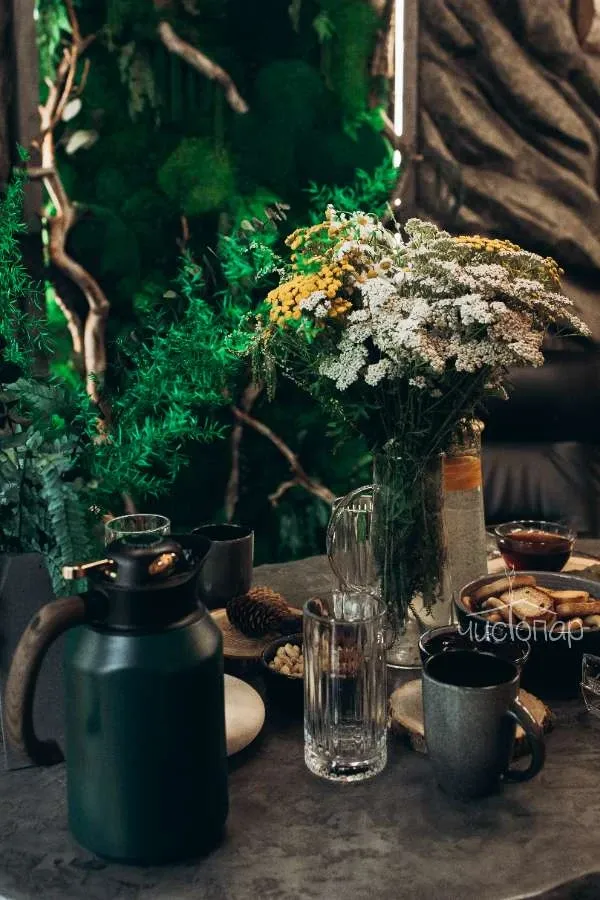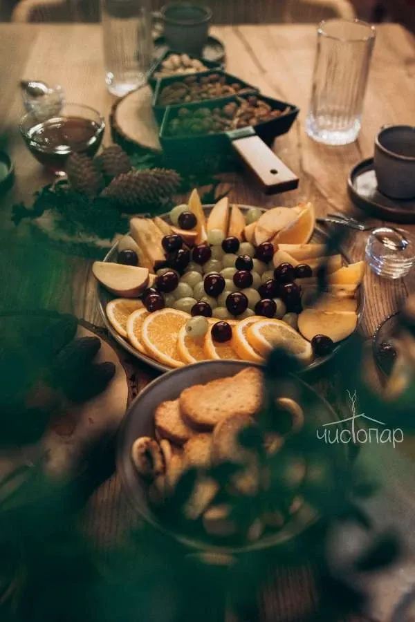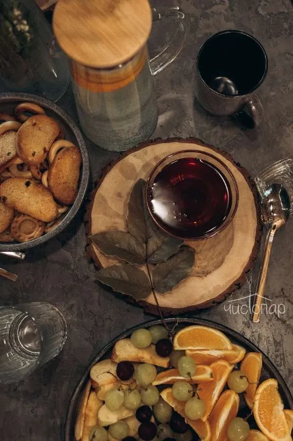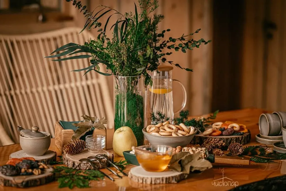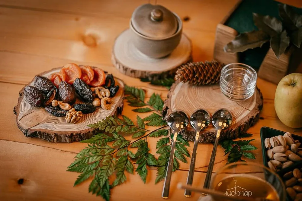 ✔️Чайный стол с угощениями (сухофрукты, фрукты, орехи, мед, варенье), вода.