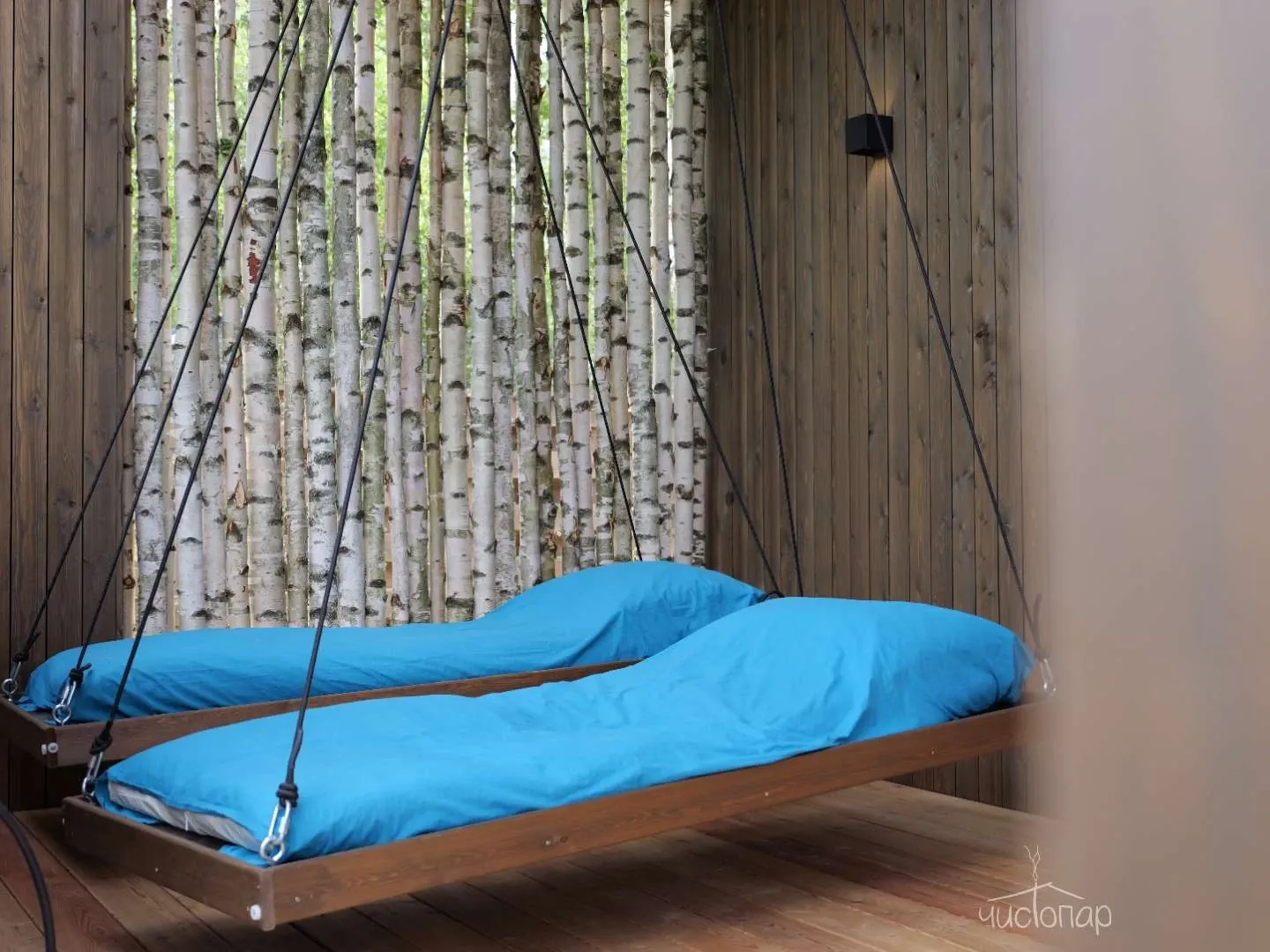 Пармастер бережно укачивает на релаксационных качелях под открытым небом, окутывая теплом, уютом и безмятежностью, словно в колыбели детства, где весь мир наполнен покоем и ощущением абсолютной безопасности.