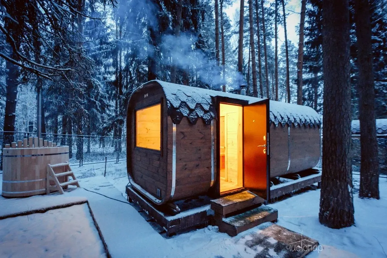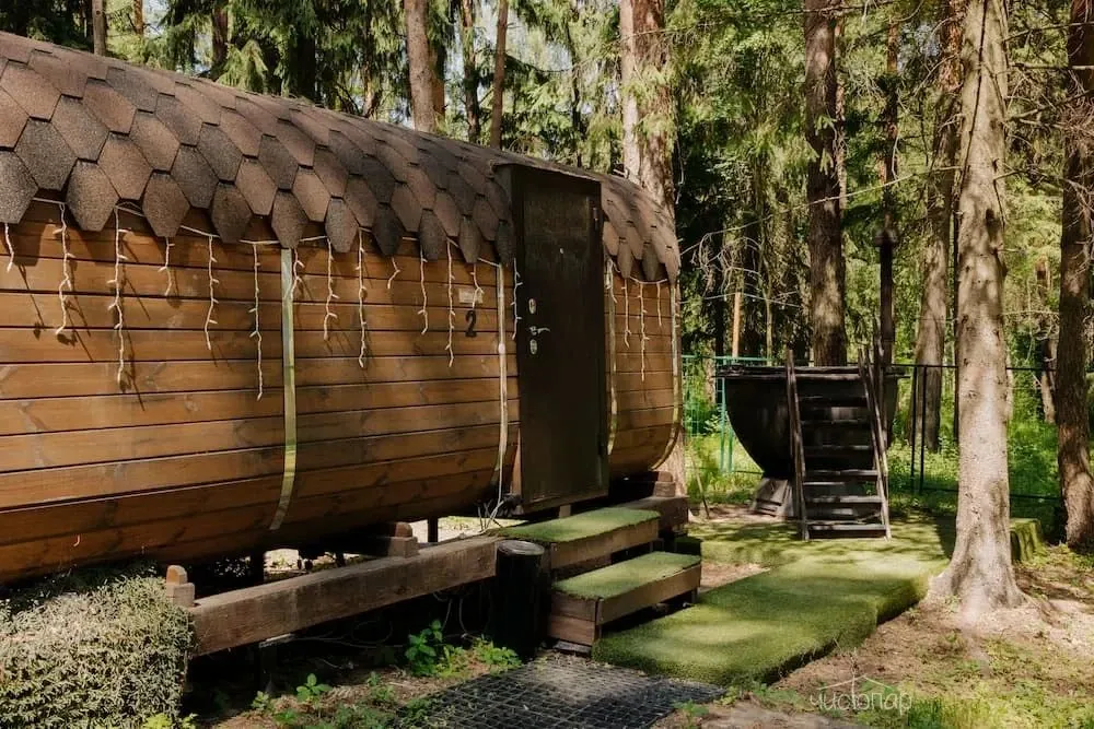 Баня-бочка «Лесная»К услугам гостей уютная и стильная баня-бочка, вмещающая компанию до 4-х гостей. Комплекс расположен в природной зоне в окружении лесного массива.