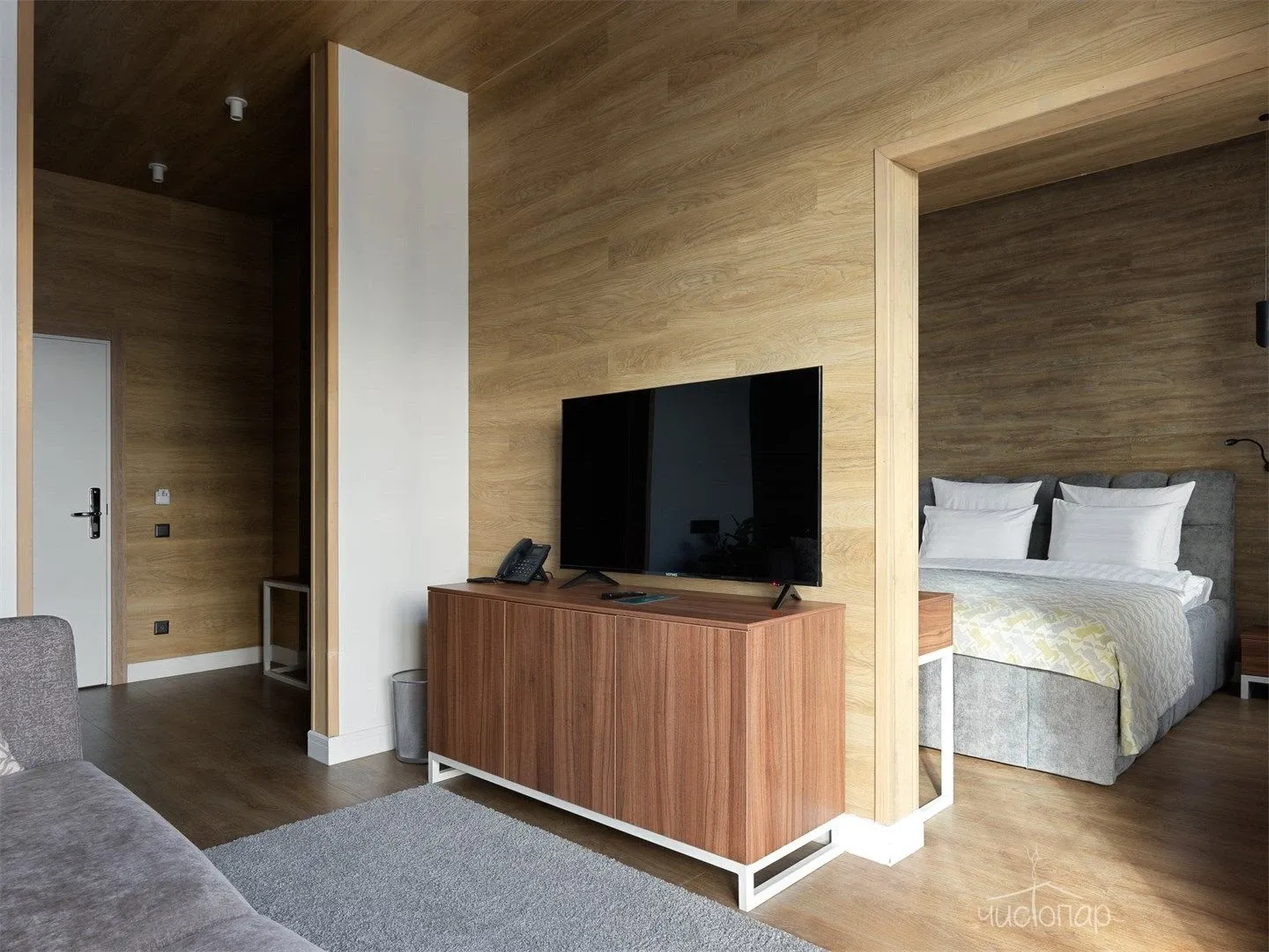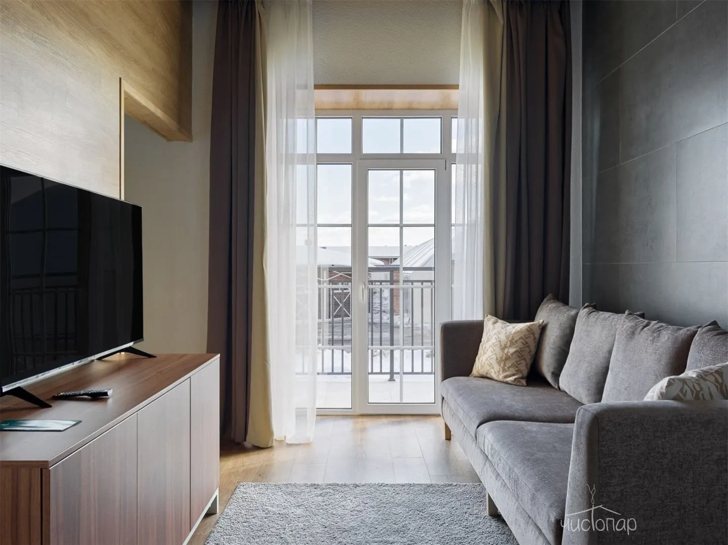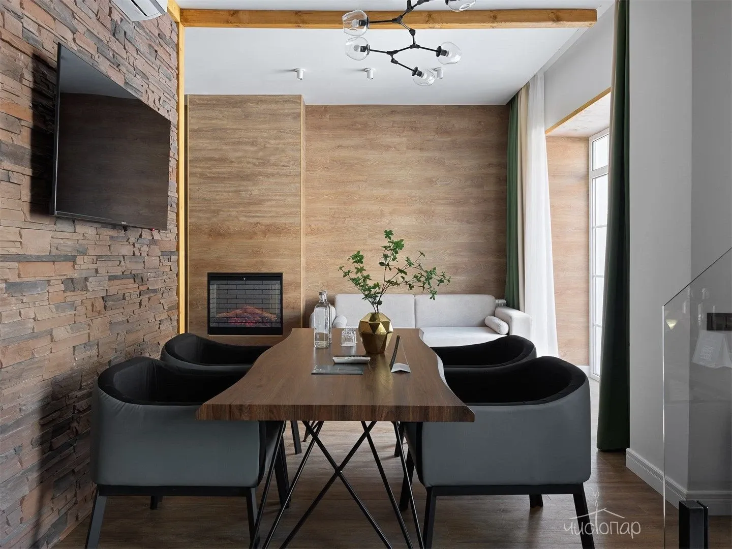 - комната с телевизором, мягкой мебелью и обеденным столом