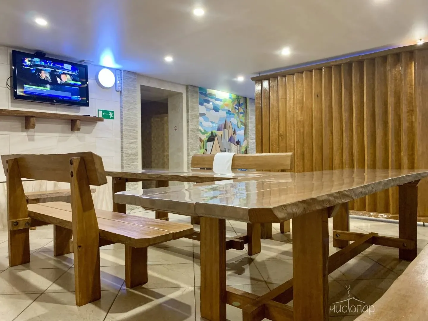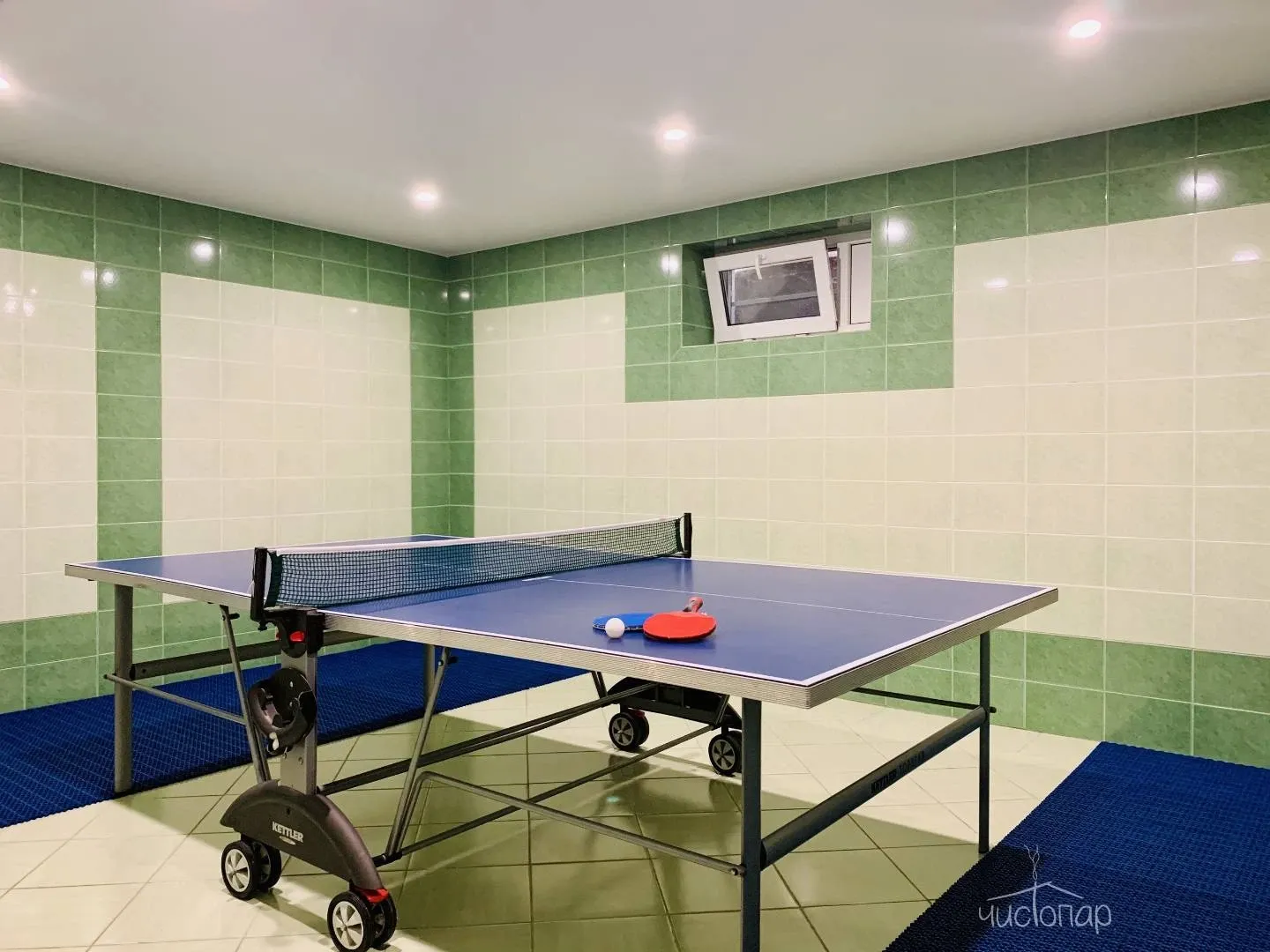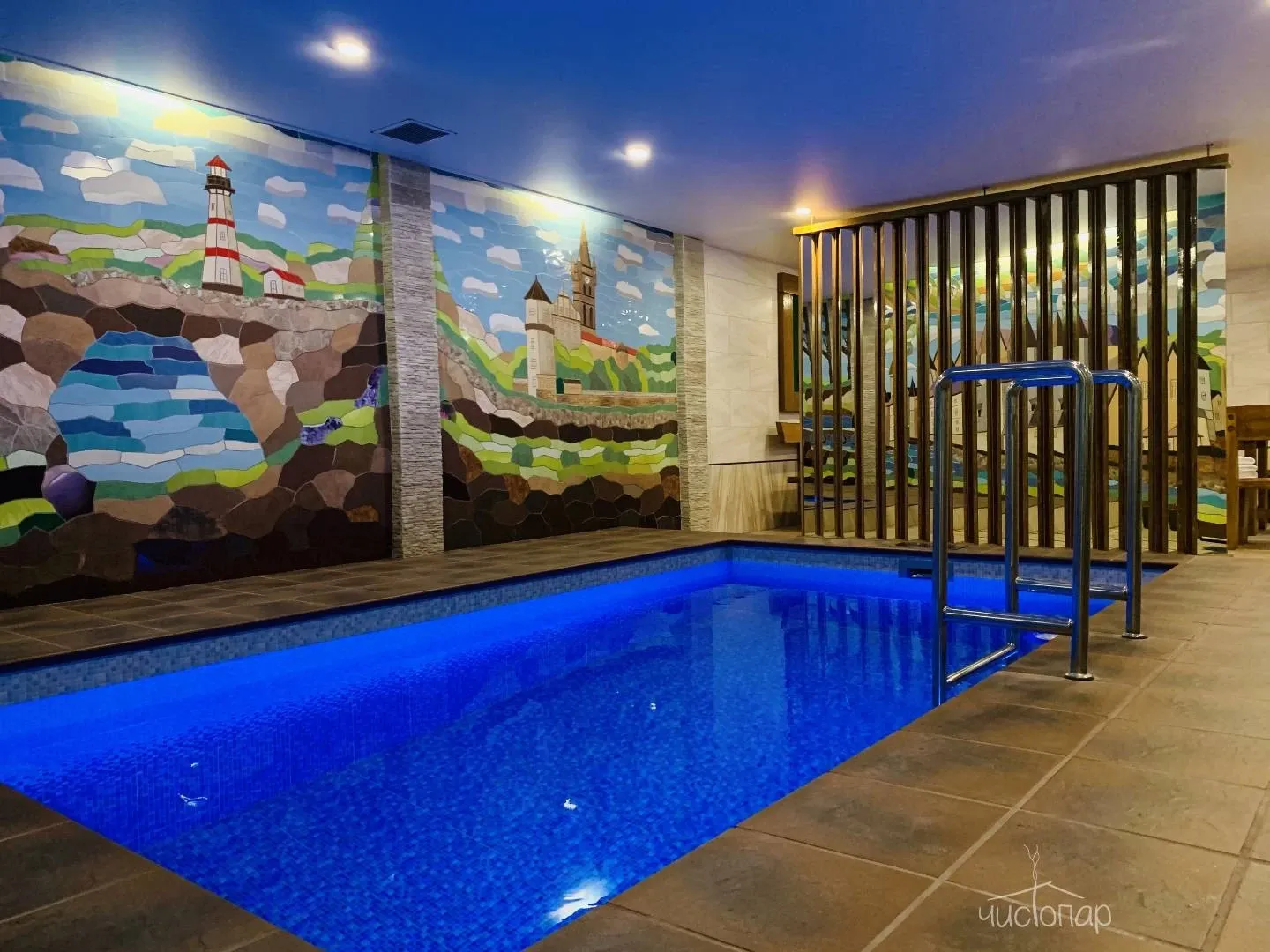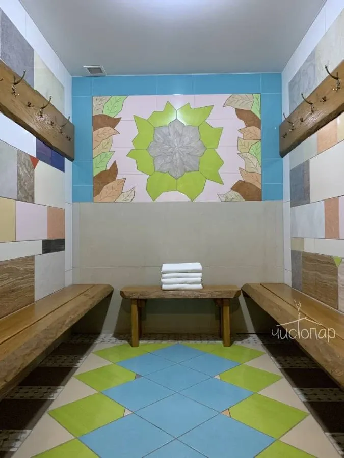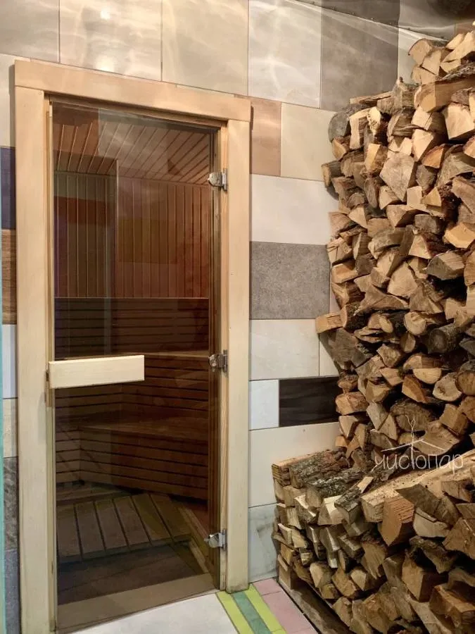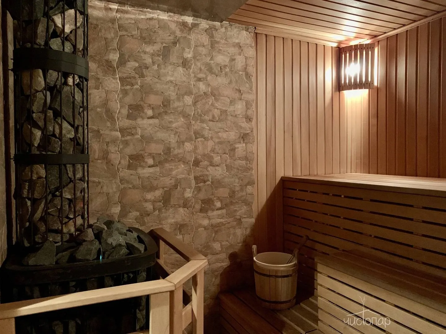 К Вашим услугам: просторная и уютная парная из натуральных материалов, где при желании можно попариться с вениками, бассейн с подогревом и подсветкой, а также зона отдыха с телевизором, вместительностью до 15 человек.