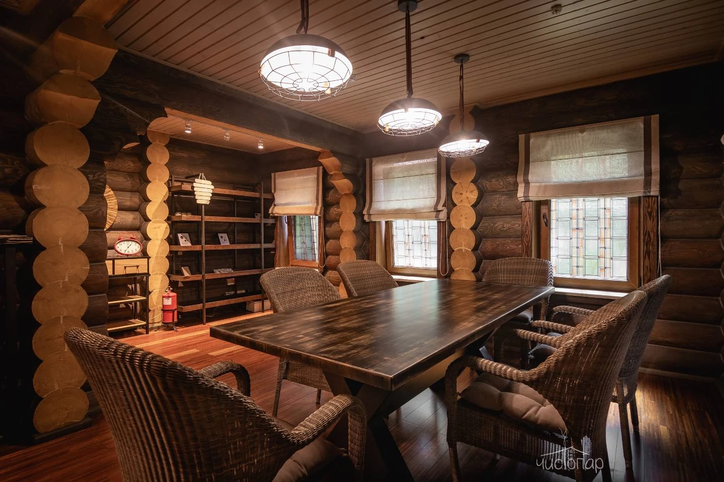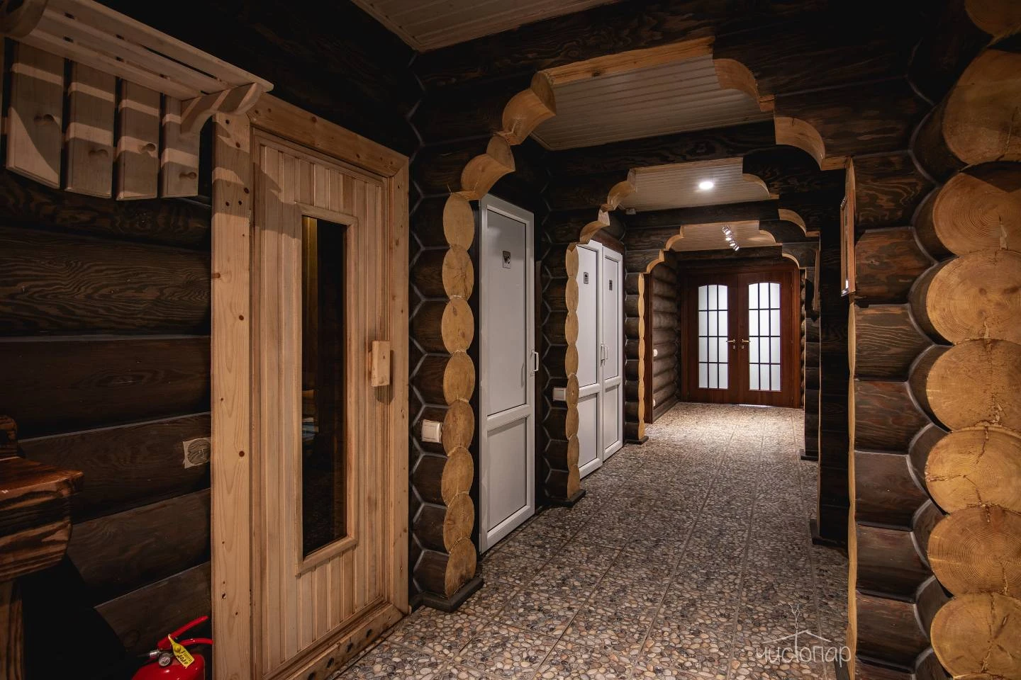 Банный комплекс включает в себя парную на дровах, прохладный бассейн, зоны для отдыха, раздевалка, санузел и душевые, в одной из которых установлено обливное устройство.