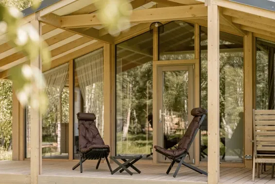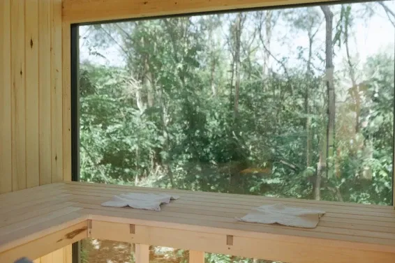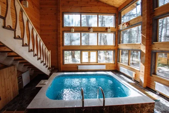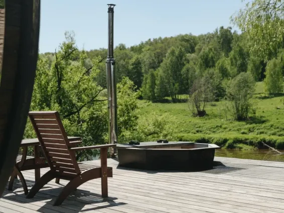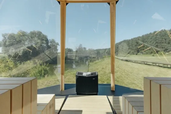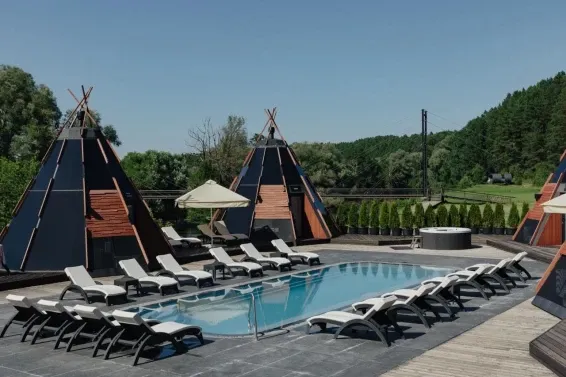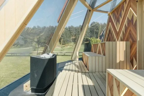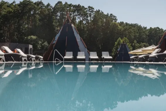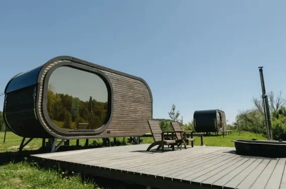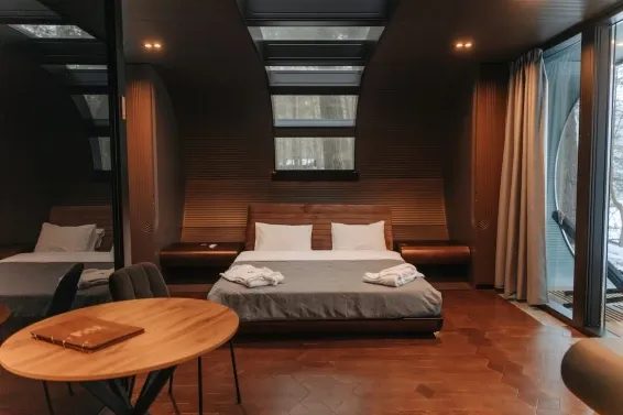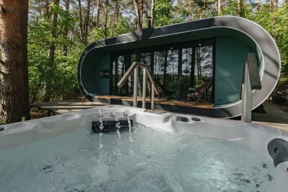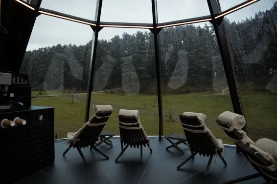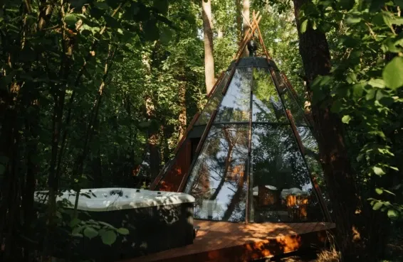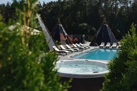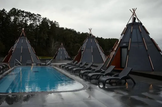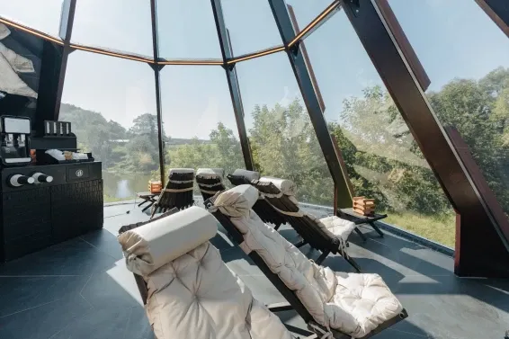 В СПА комплексе глэмпинга к услугам гостей - бассейн, джакузи, хамам, панорамная сауна, 2 комнаты отдыха с шезлонгами и чаем, массажный кабинет. Комплекс вмещает до 30 человек.