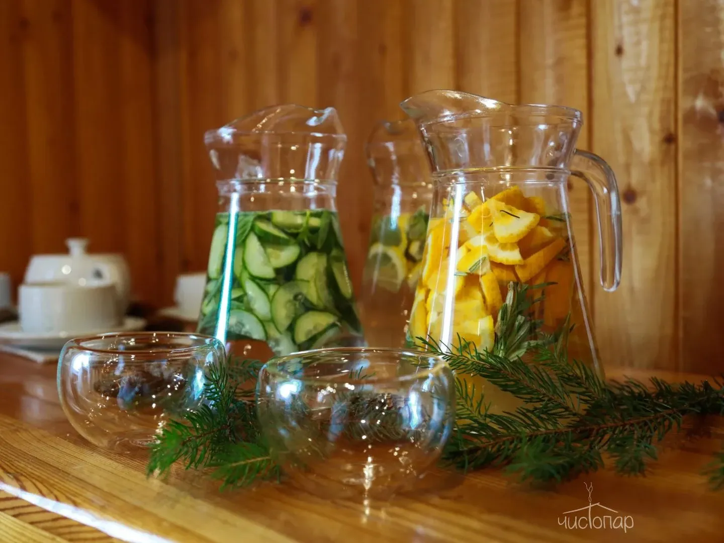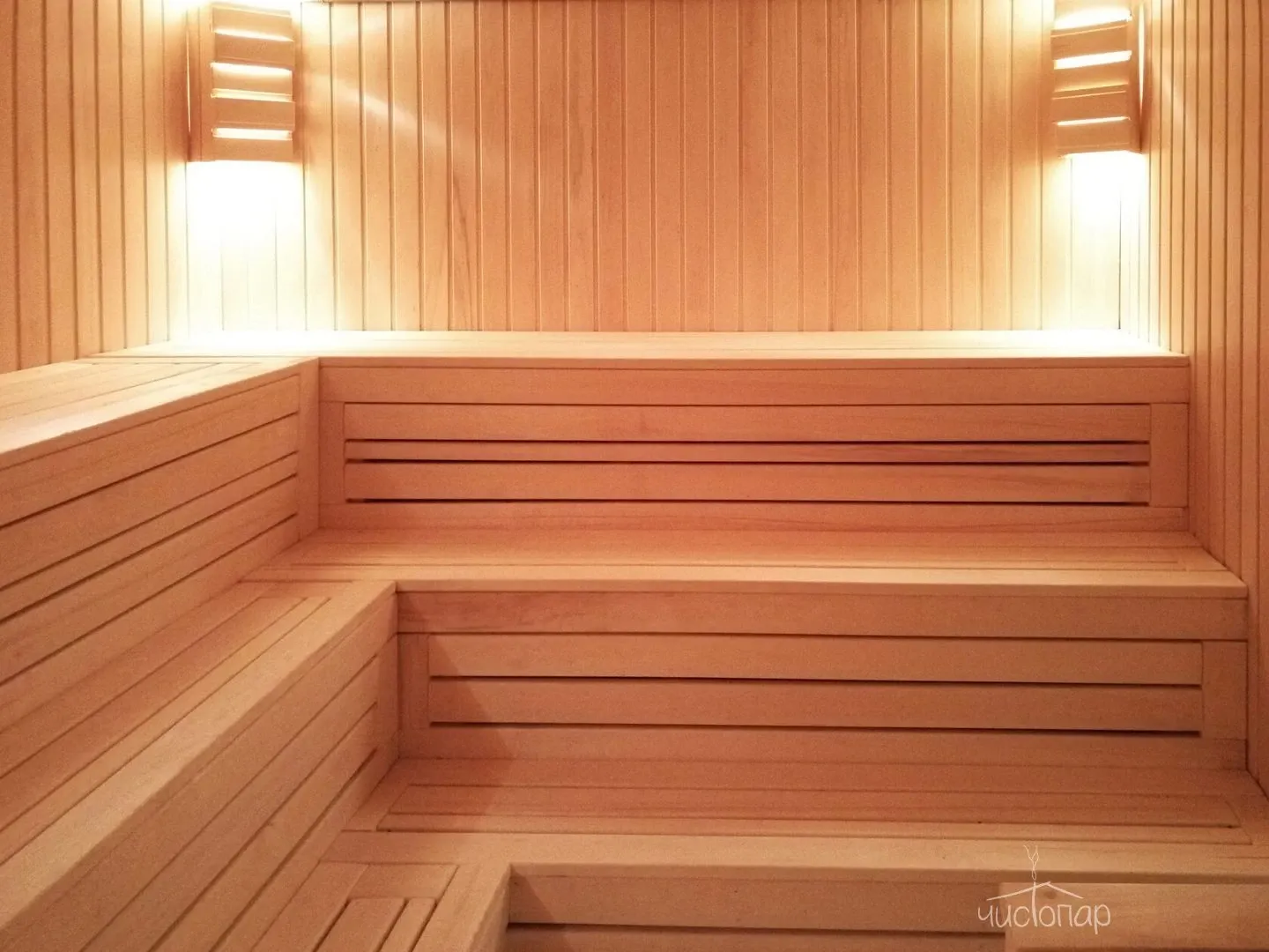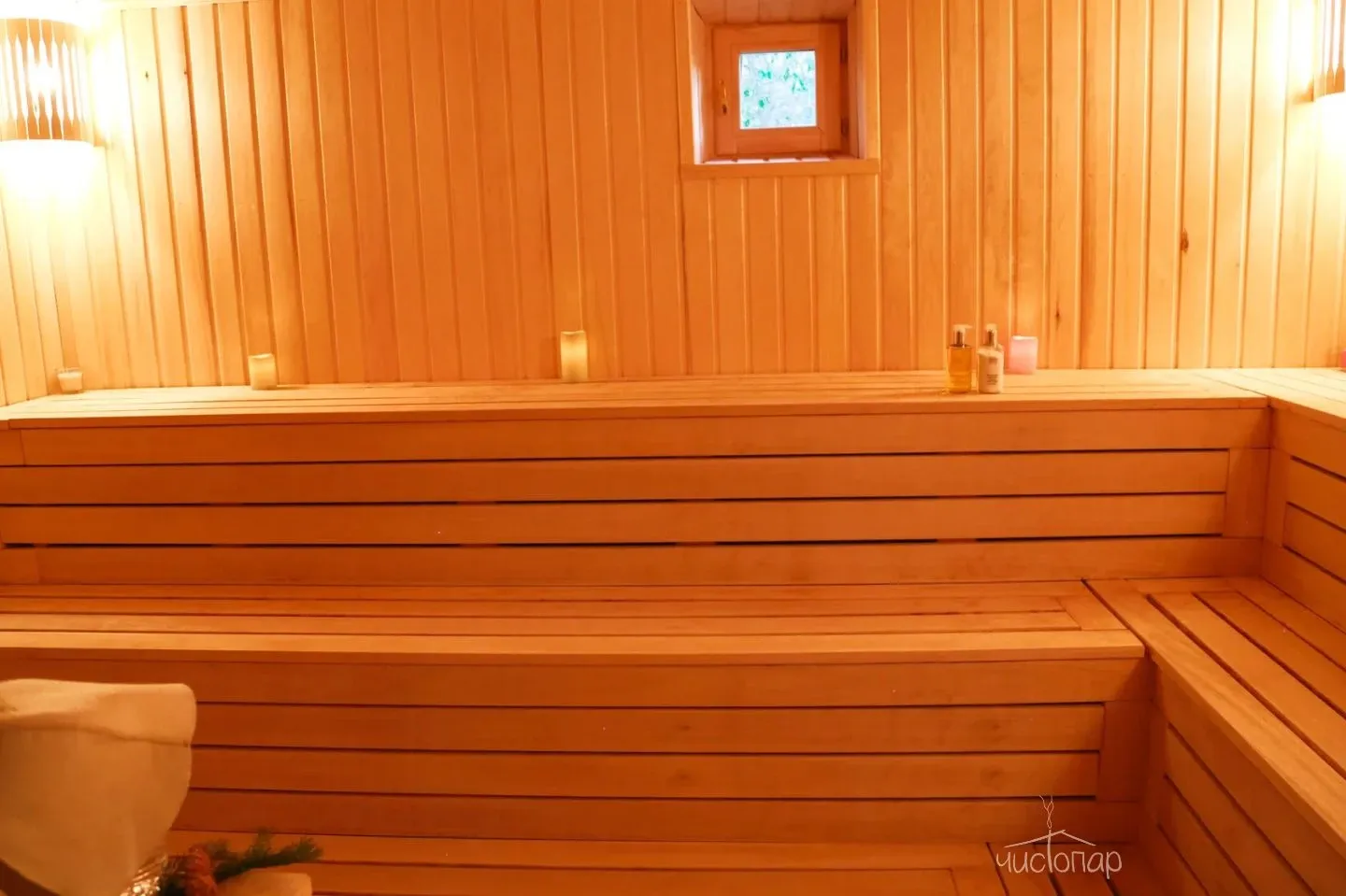 Парная сделана из липы и абаша, а камень пироксенит благотворно влияет на повышение иммунитета организма, коррекцию артериального давления, укрепление сосудов, очистку от токсинов и лечению органов дыхания.