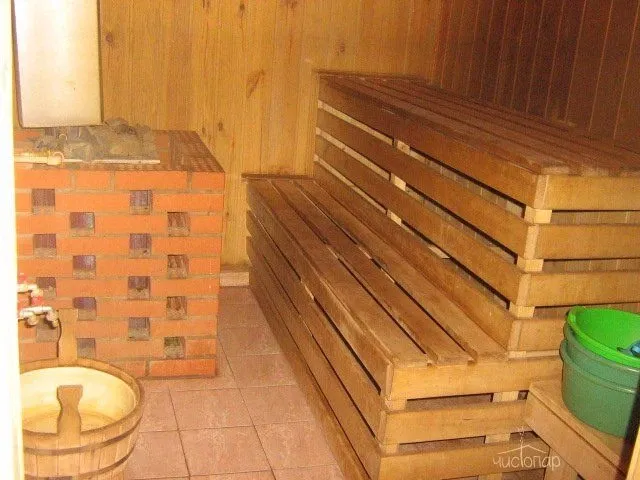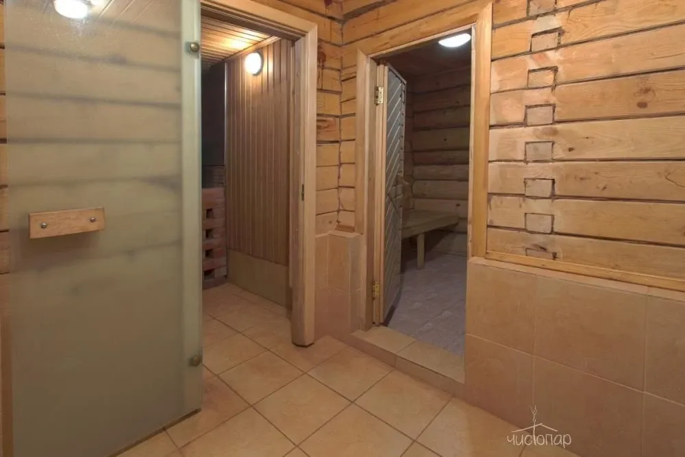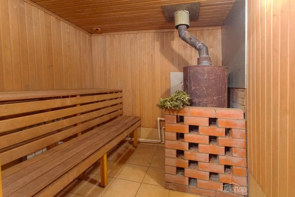 • Большая баня на дровах сделана в современном деревенском стиле.
