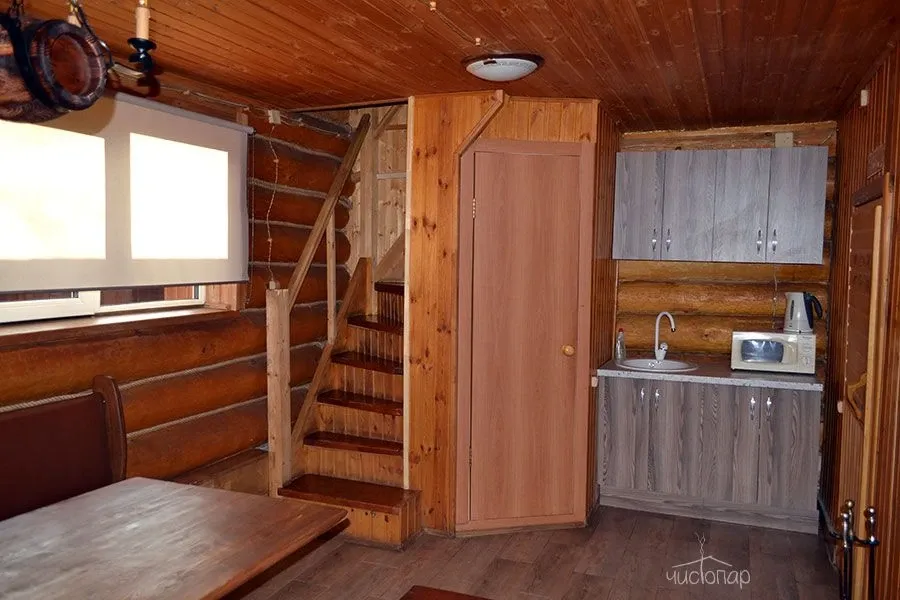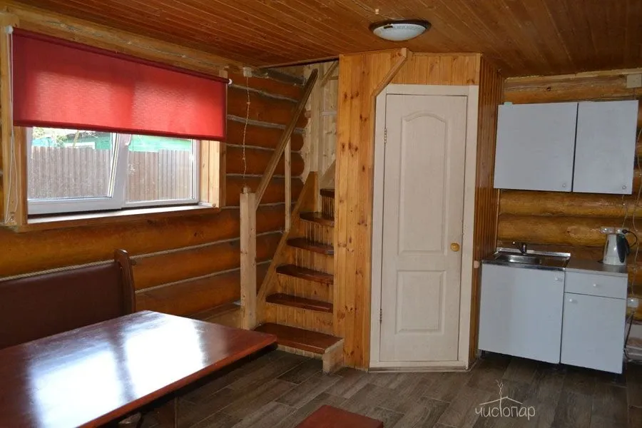 В состав банного комплекса «Деревяшки» входят бани на дровах: баня №1, баня №2, баня с бассейном и Малая баня. Каждая баня представляет собой сруб, возведенный из рубленых бревен. Первый этаж занимает комната с большим столом, телевизором, караоке, парная, душевая и туалет. В душевой имеется обливное устройство (ведерко с ледяной водой). Полы первого этажа обустроены подогревом. На втором этаже располагаются две спальни, поэтому весть возможность арендовать баню и на ночь, и на сутки. Рядом с каждой баней имеется мангал и беседка.