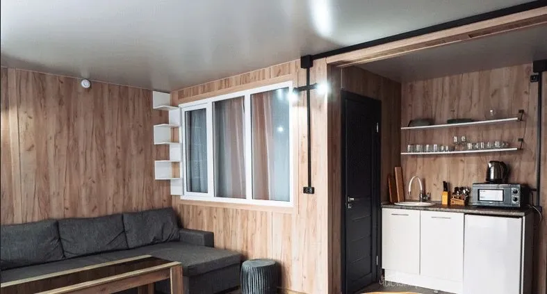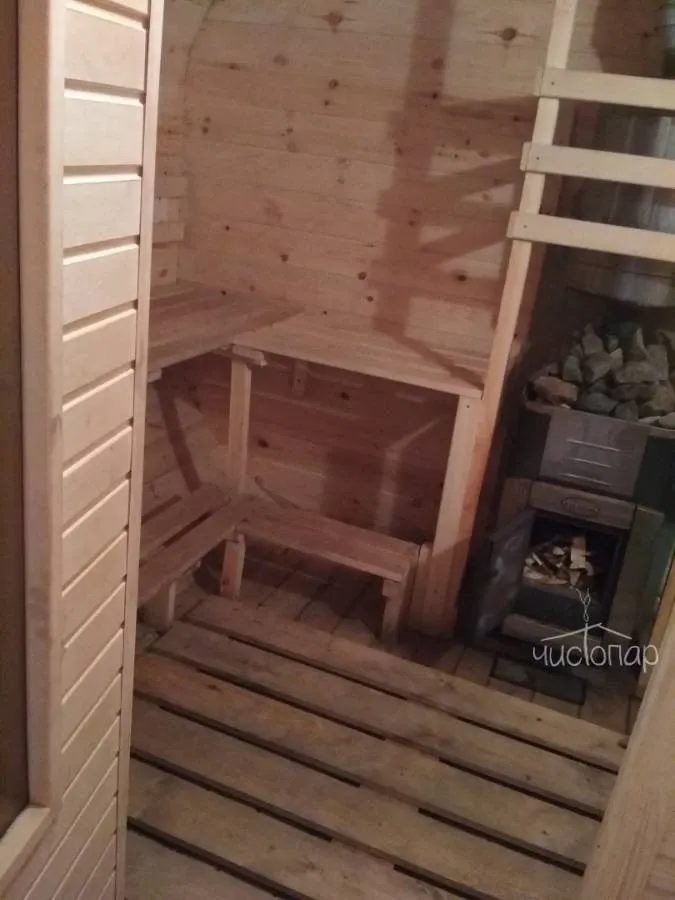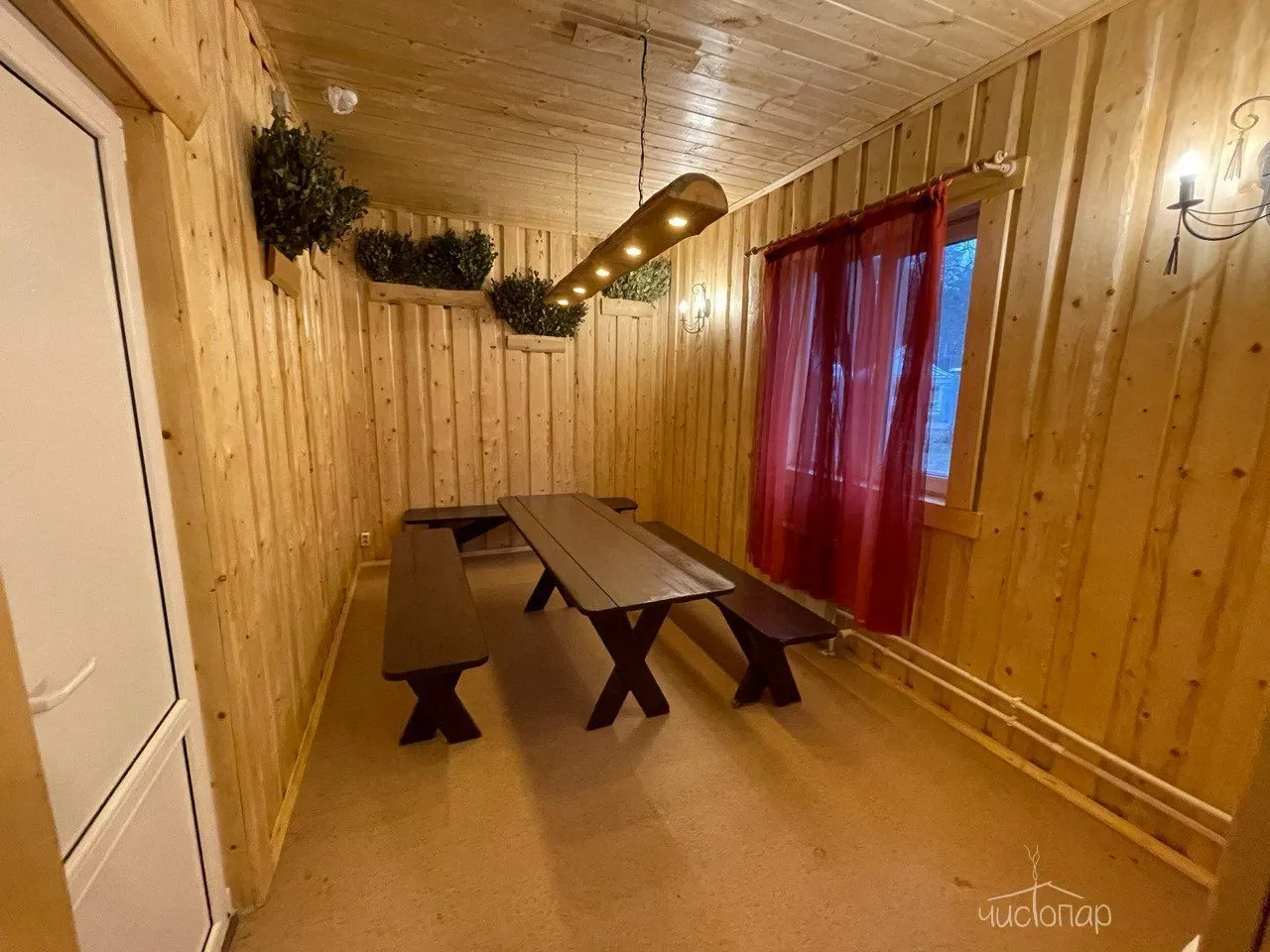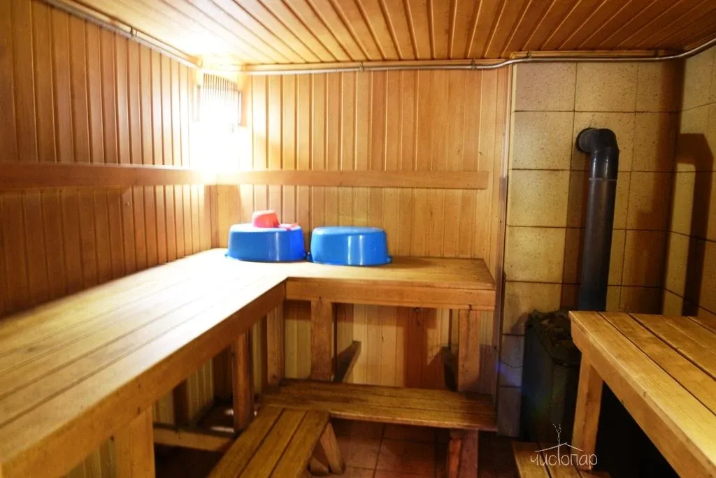 Внутри бани есть зона отдыха, парная, санузел и горячая купель снаружи.