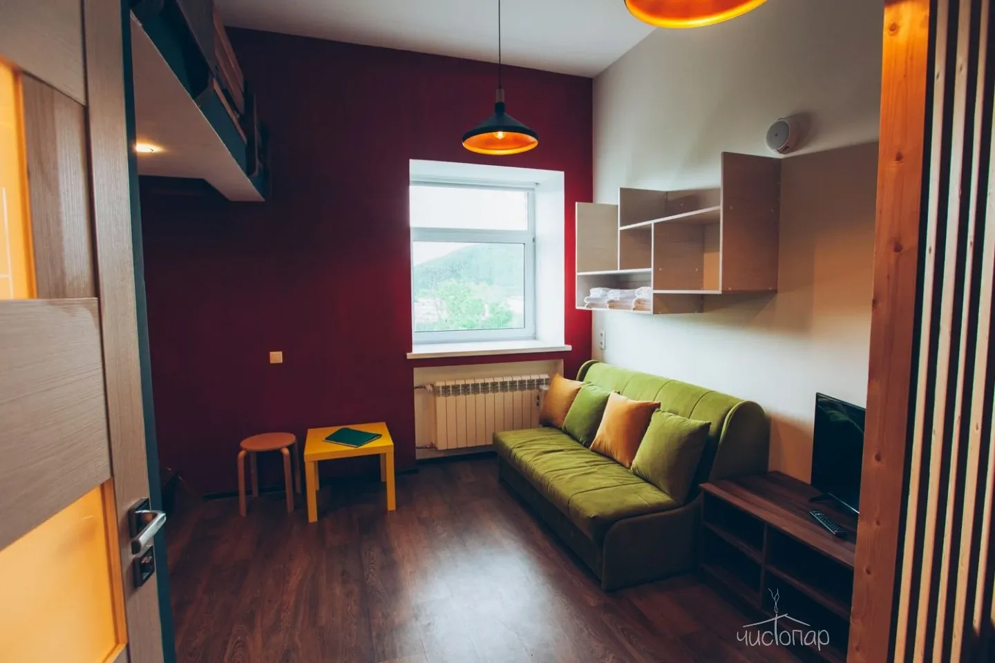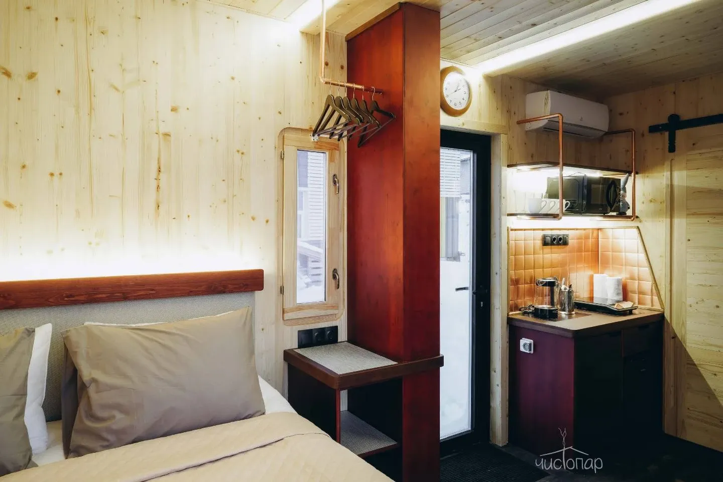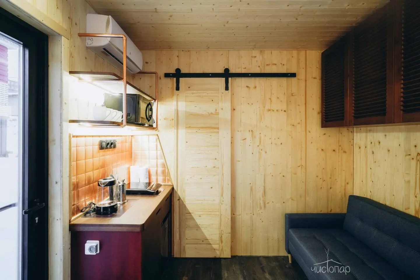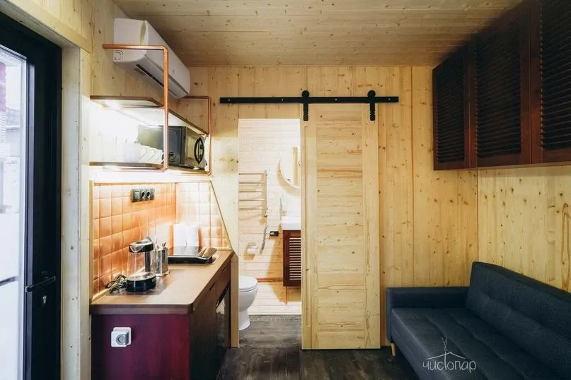 Гостевой домМодульный гостевой дом с панорамным окном с видом на горы. Компактный дом во дворе отеля Powder — комфорт и уединенность с возможностью пользоваться всеми услугами отеля. Площадь коттеджа - 18 метров. Оборудован собственной мини-кухней, в ванной комнате установлен мощный водонагреватель.