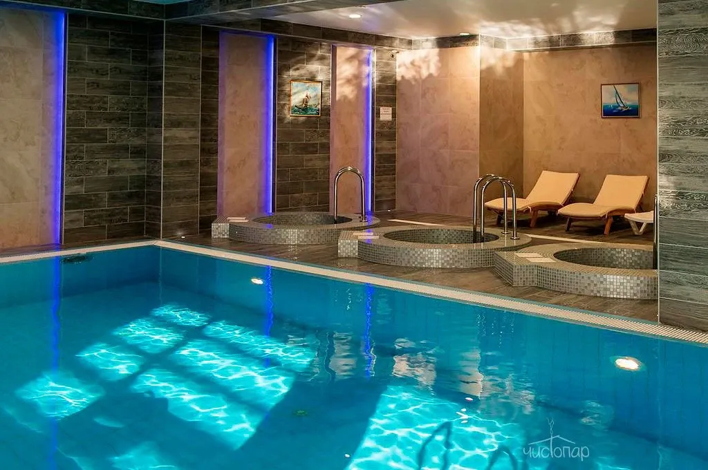 На территории комплекса расположен внушительный SPA-комплекс с 7 видами бань и большой плавательный бассейн с 13 дорожками