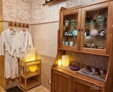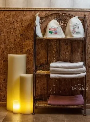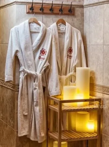- Банные принадлежности на каждого: тапочки и шапочка одноразовые, халат, гигиенический набор для принятия душа.