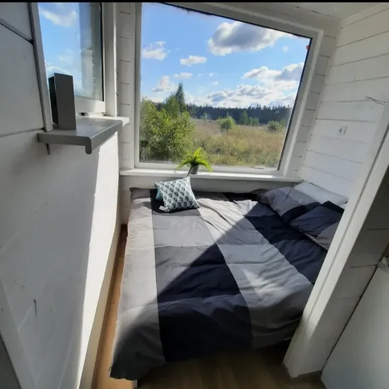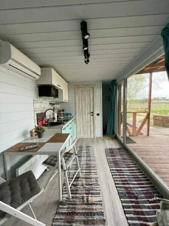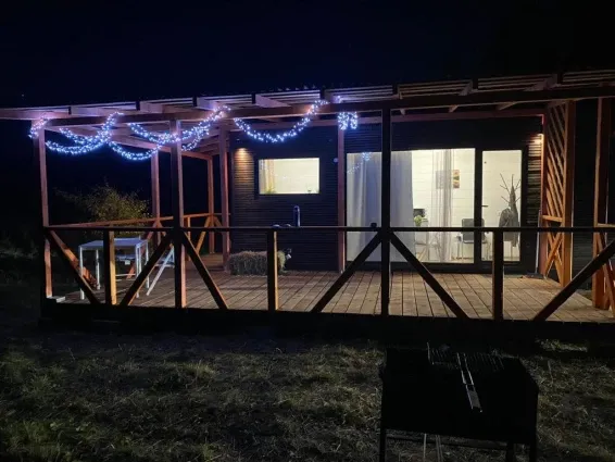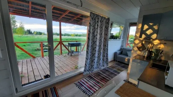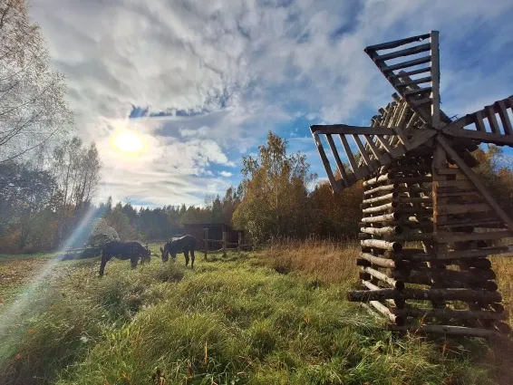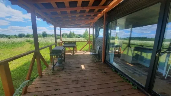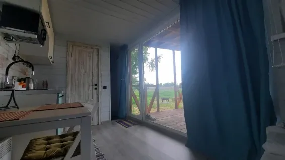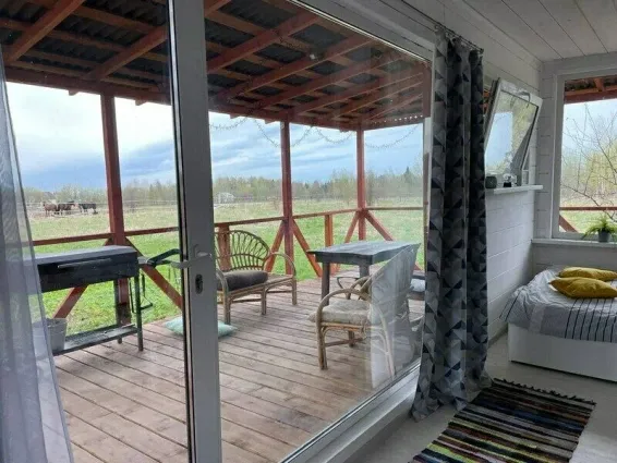 - Дома в лесу с панорамными окнами и видом на лошадей