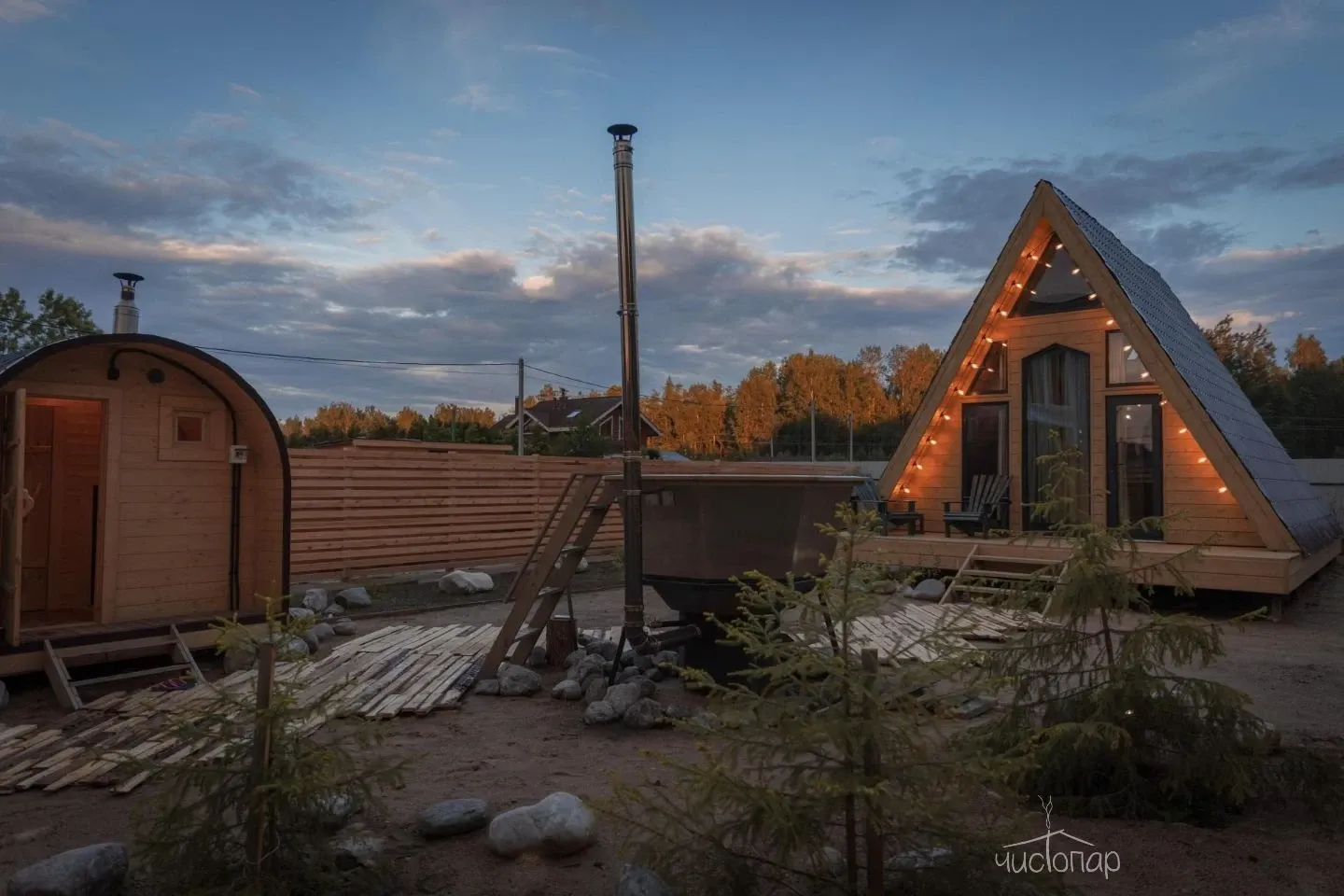 Территория Сеновала вмещает мангальную зону, баню на дровах и банный чан для парения под открытым небом. В качестве дополнения за отдельную плату здесь предлагают веники из канадского дуба, травяной чай и банные шапочки.