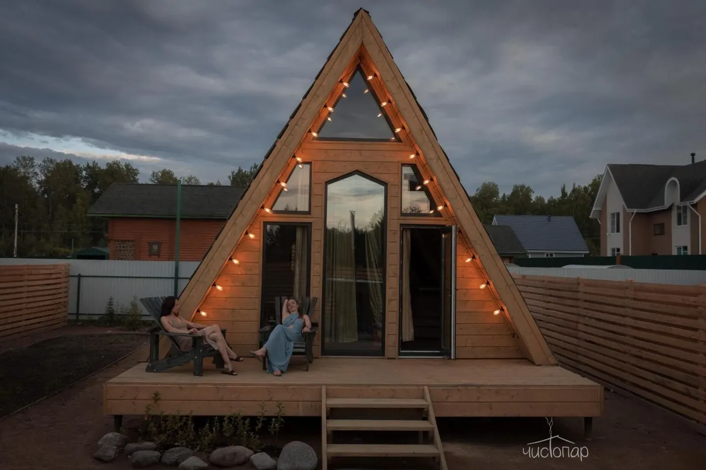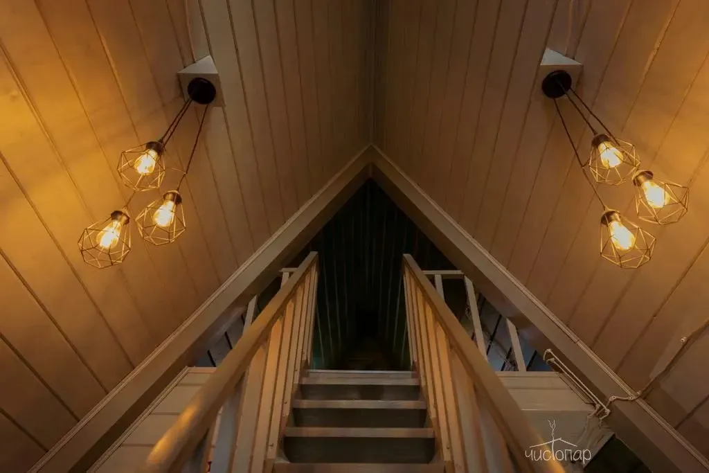Остаться на ночь можно в двухуровневом А-образном доме с террасой и панорамными окнами. Треугольный коттедж оснащен всем необходимым для комфортного проживания. На втором этаже оборудована уютная спальня, а на первом - зона кухни. Здесь же есть душевая комната.