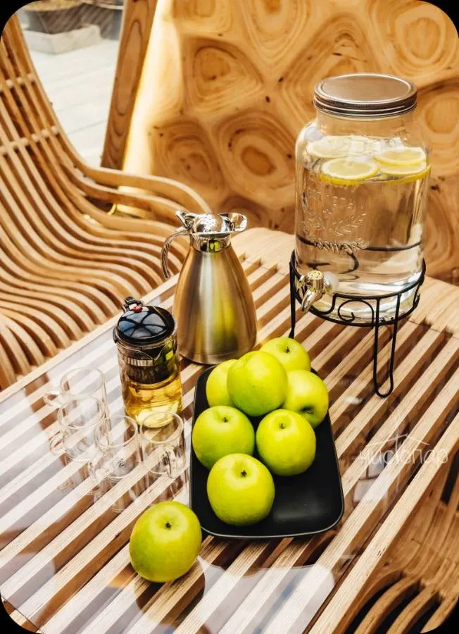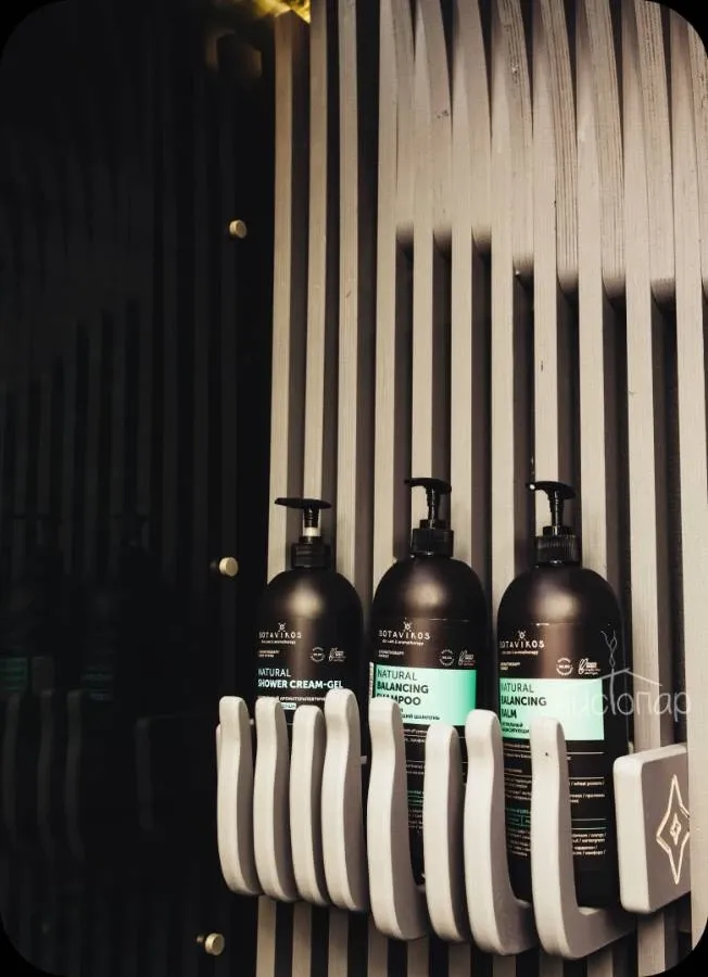 Индивидуальный набор для каждого посетителя: халат, полотенце, шапочка и тапочки. Также в бане уже есть косметические принадлежности: шампунь, гель, бальзам и мыло. А в зоне отдыха графин лимонной воды и яблоки!