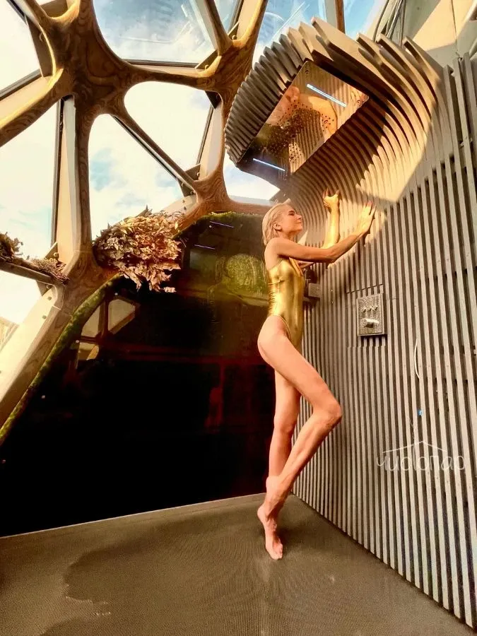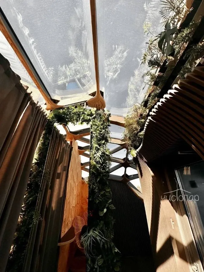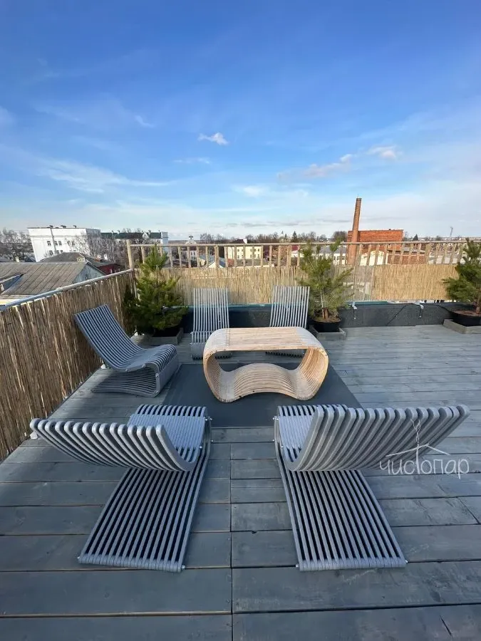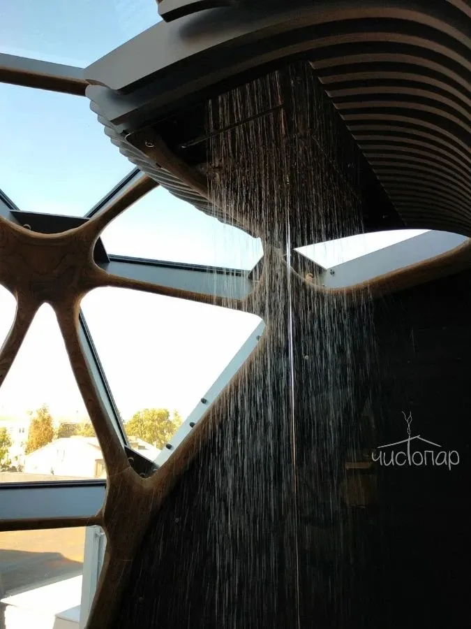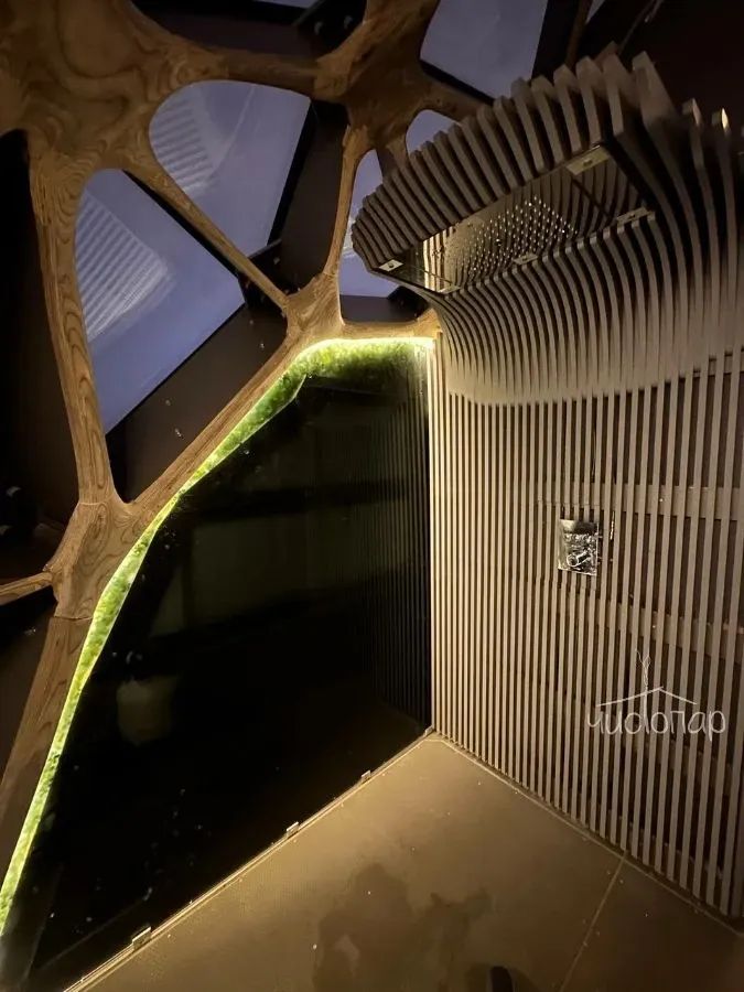 На террасе предусмотрены как холодная купель, так и теплая джакузи. Изысканный бионический дизайн в каждой детали отделки и мебели, а также вертикальное озеленение.