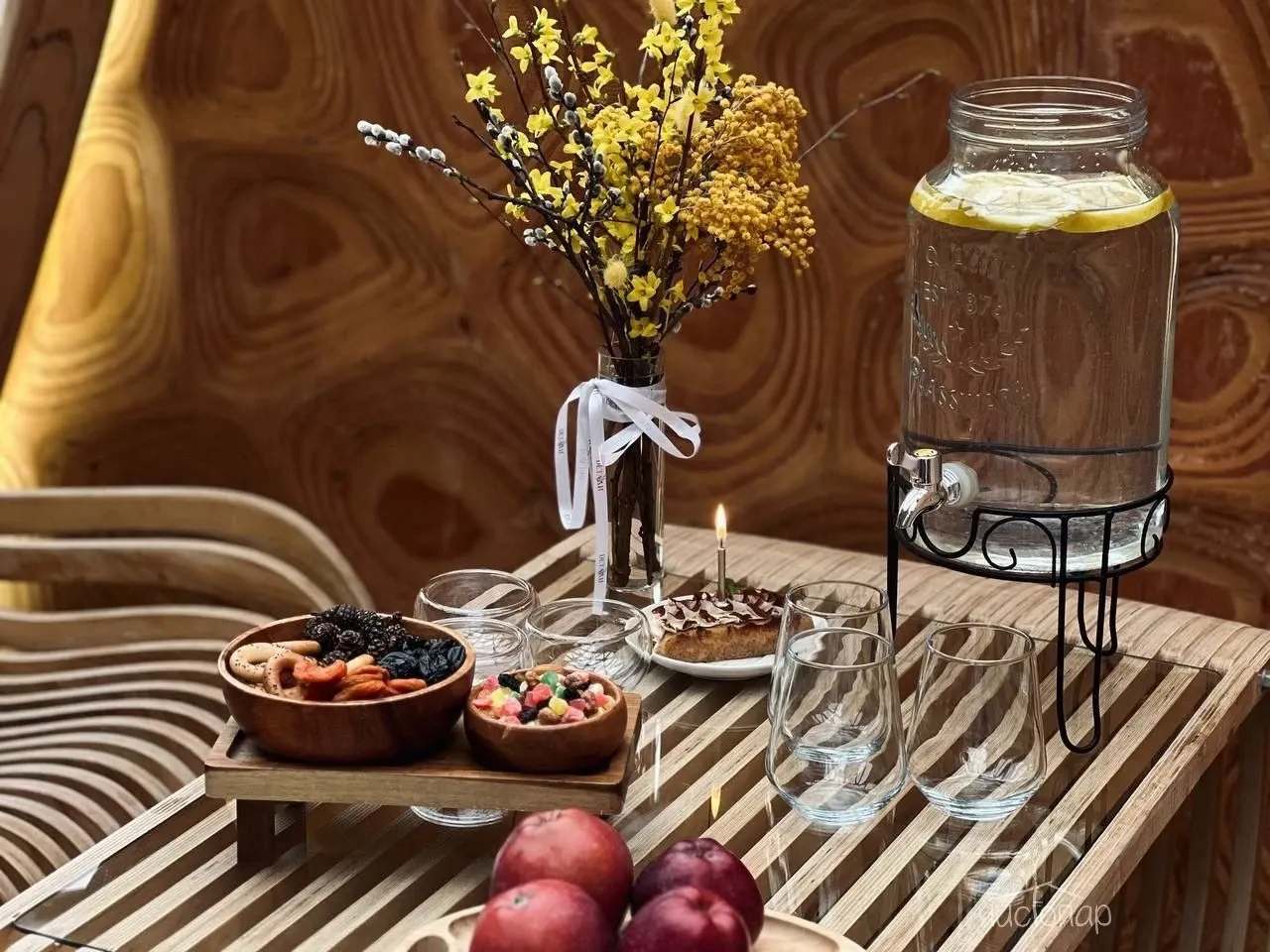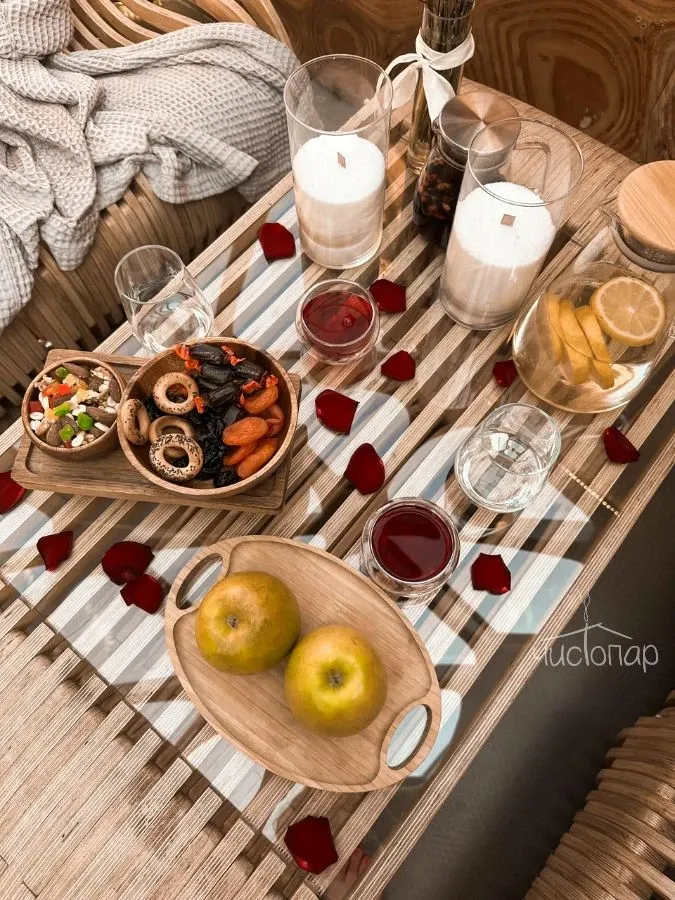 Мы готовим приветственный набор: графин с лимонной водой, чайник чая, яблоки, сухофрукты и орешки.