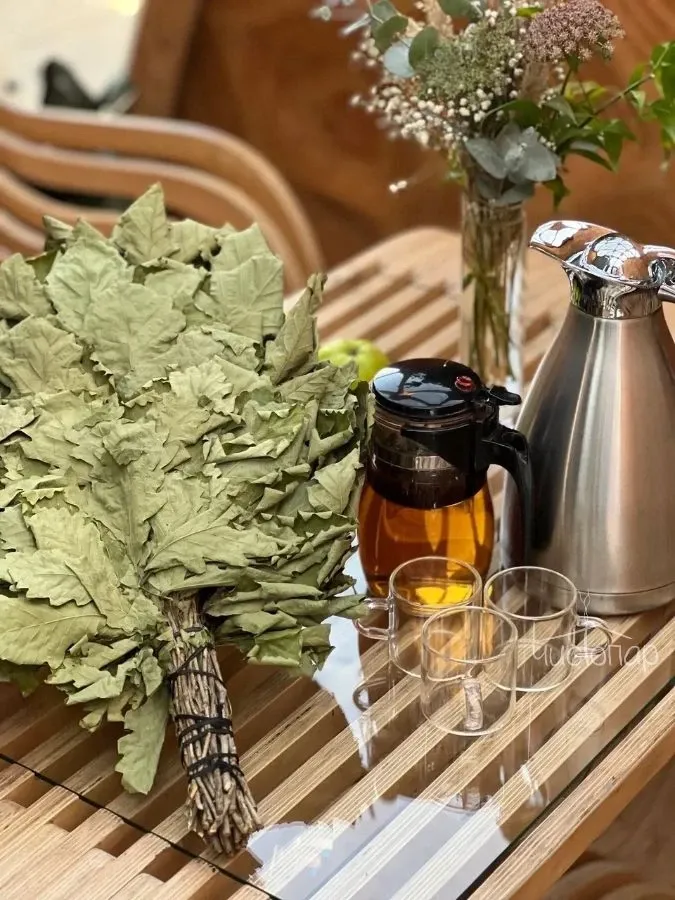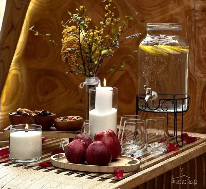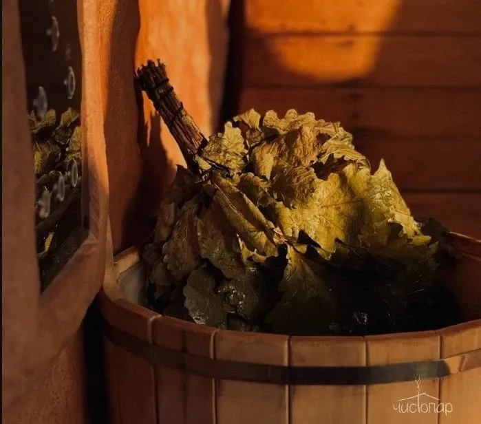Комплекс банных процедур парения с дубовым веником, травяными ваннами и освежающим чаем. Приветственный набор: графин с лимонной водой, чайник чая, яблоки, сухофрукты и орешки.