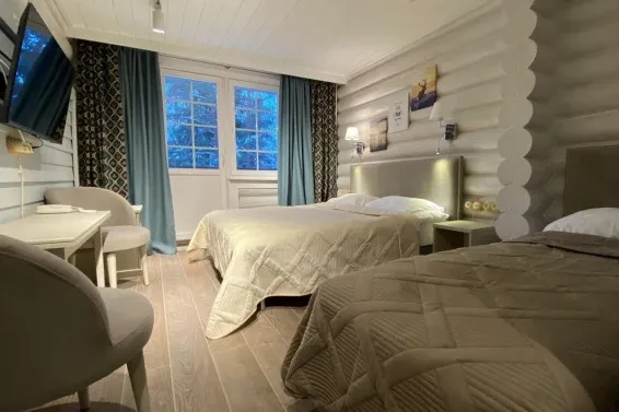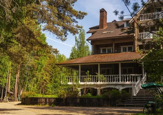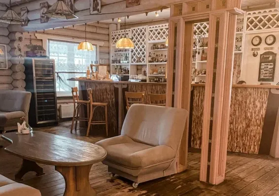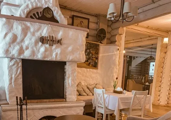 На первом этаже главного корпуса расположен уютный ресторан с камином, где можно согреться холодными зимними вечерами, а в теплое время года для гостей работает летняя веранда с панорамным видом на озеро и лес.