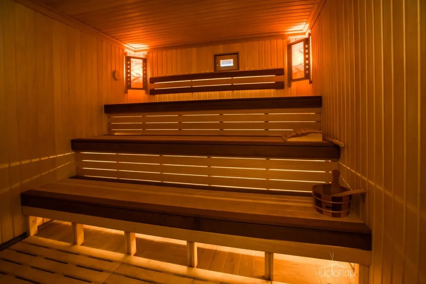 Весь банный комплекс сложен из натурального бревна, которое привлекает к себе внимание природной основой и непритязательной красотой. Сердце нашего комплекса, парная, отделана панелями из гималайской соли и деревом сорта абаш. Этот африканский дуб слабо нагревается даже при самых высоких температурах.
