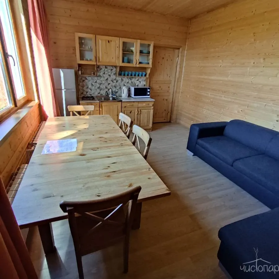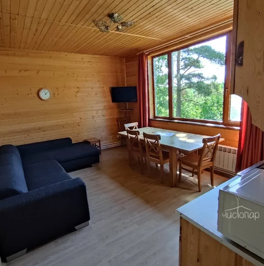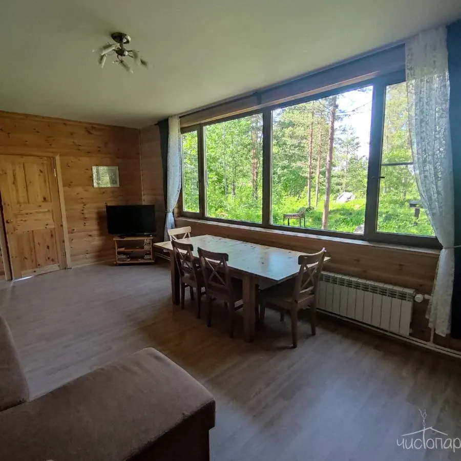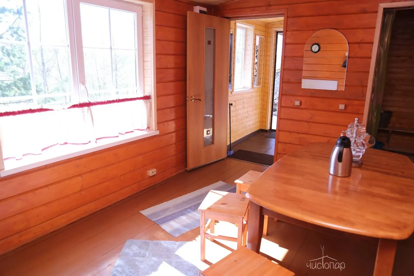Дом со всеми удобствами. В доме две спальни: в одной - одна двуспальная кровать, в другой - две односпальные. Гостиная, совмещенная с кухней, панорамное окно с видом на лес, туалет, душ; рядом с домом своя зона барбекю (мангал, большой стол со скамейками, летом гамак, шезлонг, качели). В доме есть вся необходимая посуда, столовые приборы, микроволновая печь, электрический чайник, плита на две конфорки, холодильник, фен, телевизор. По запросу предоставляется детская кроватка и стульчик для кормления.