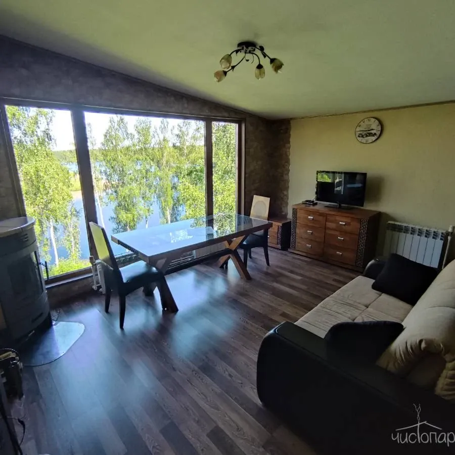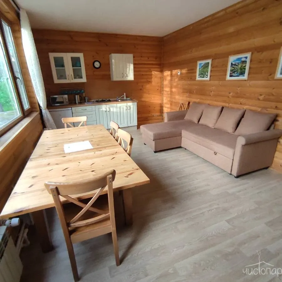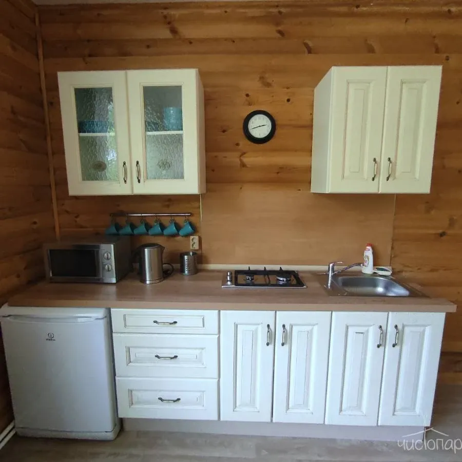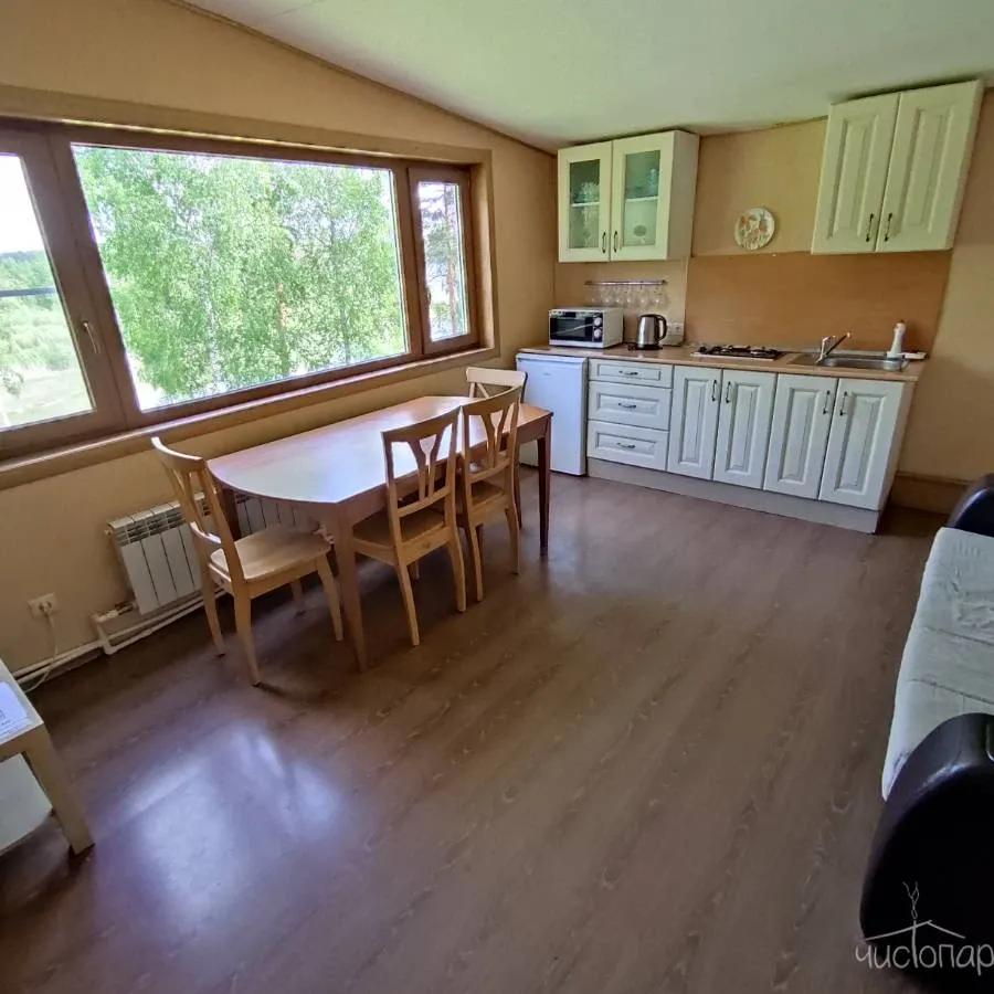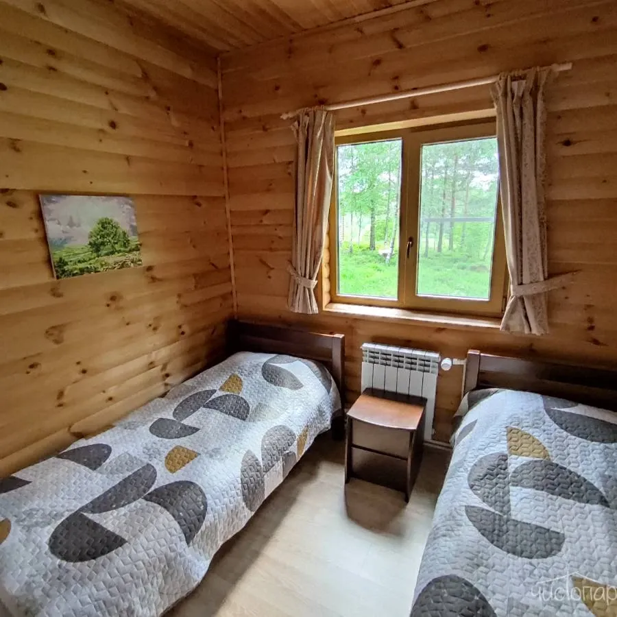 Дом со всеми удобствами. В доме две спальни: в одной - одна двуспальная кровать, в другой - две односпальные. Гостиная, совмещенная с кухней, панорамное окно с видом на лес, туалет, душ; рядом с домом своя зона барбекю (мангал, большой стол со скамейками, летом гамак, шезлонг, качели). В доме есть вся необходимая посуда, столовые приборы, микроволновая печь, электрический чайник, плита на две конфорки, холодильник, фен, телевизор. По запросу предоставляется детская кроватка и стульчик для кормления.