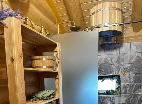 Сруб настоящей русской бани из ангарской сибирской сосны с могучей чугунной печью на дровах. Атмосфера старинной деревенской баньки в сочетании с техническими новшествами перевернут представление гостей о бане.