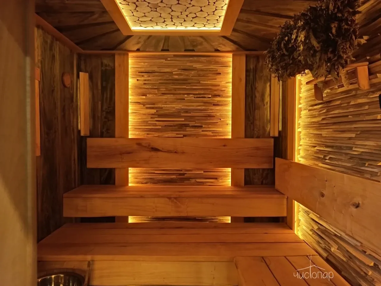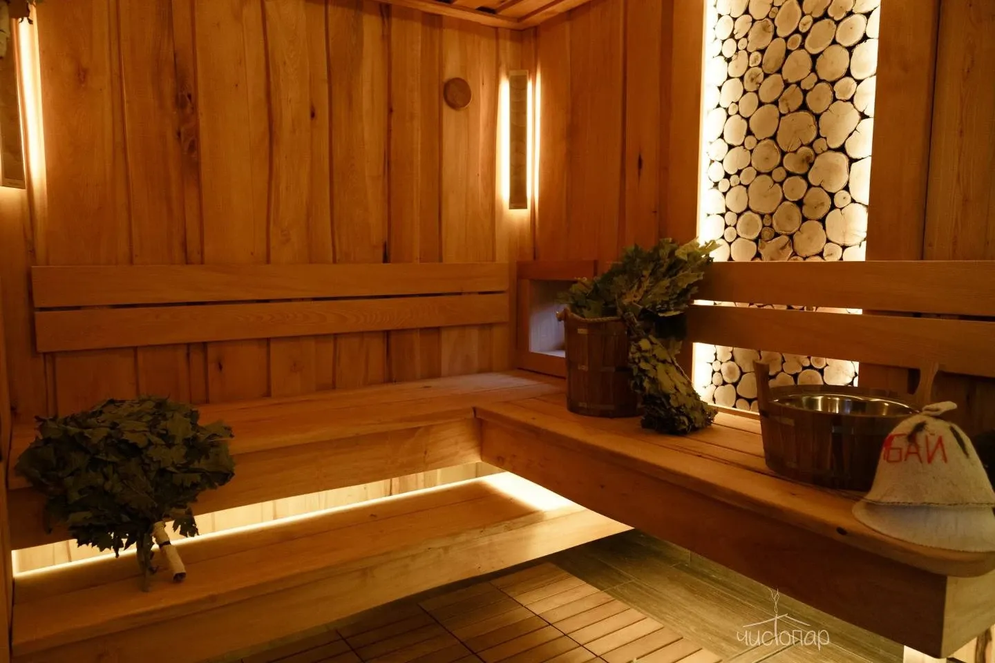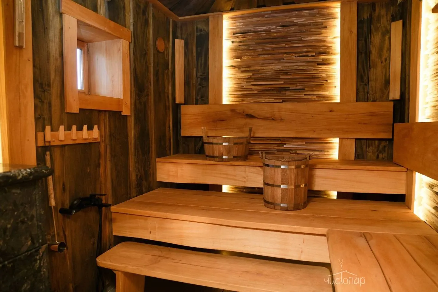 В комплекс входит две бани вместимостью 6 и 12+ человек, оснащённые по последнему слову банной техники. Для качественного пара в парных установлены специальные печи с защитой от пожара. Помещения отделаны натуральными материалами: деревом и камнем. Хаммам, русская парная, бассейн с гидромассажем, обливное устройство, комната отдыха.