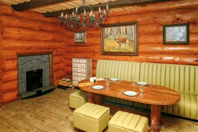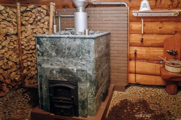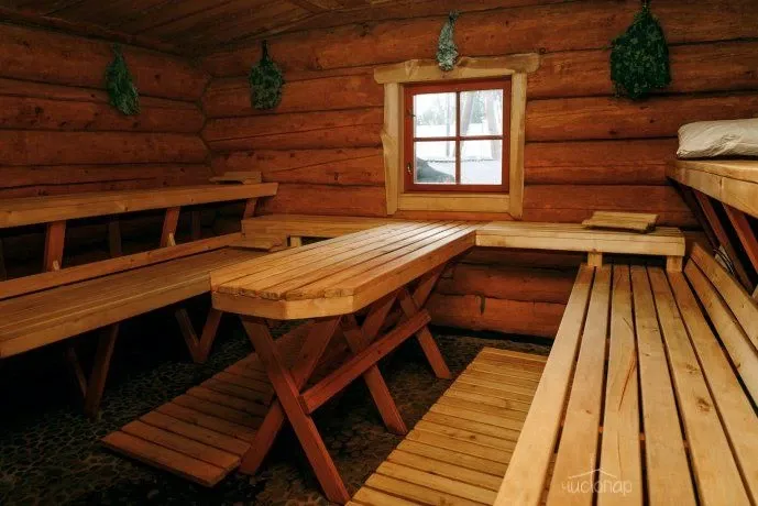 В просторной парилке с печью и каменкой есть два ряда широких полков, установленных вдоль противоположных стен, и скамья под окнами. Посредине дополнительный столик для парения, массажа, процедур по очищению кожи.