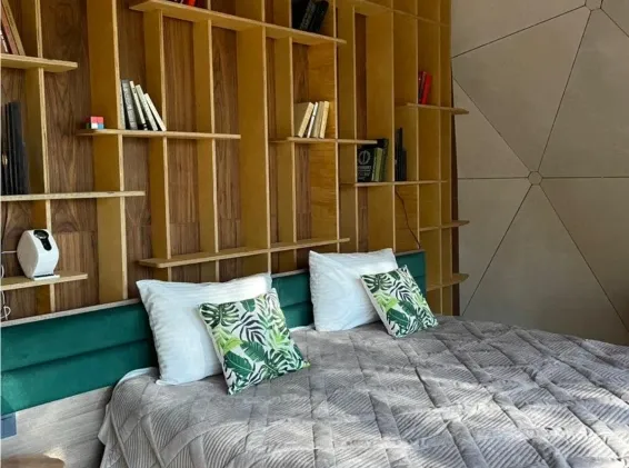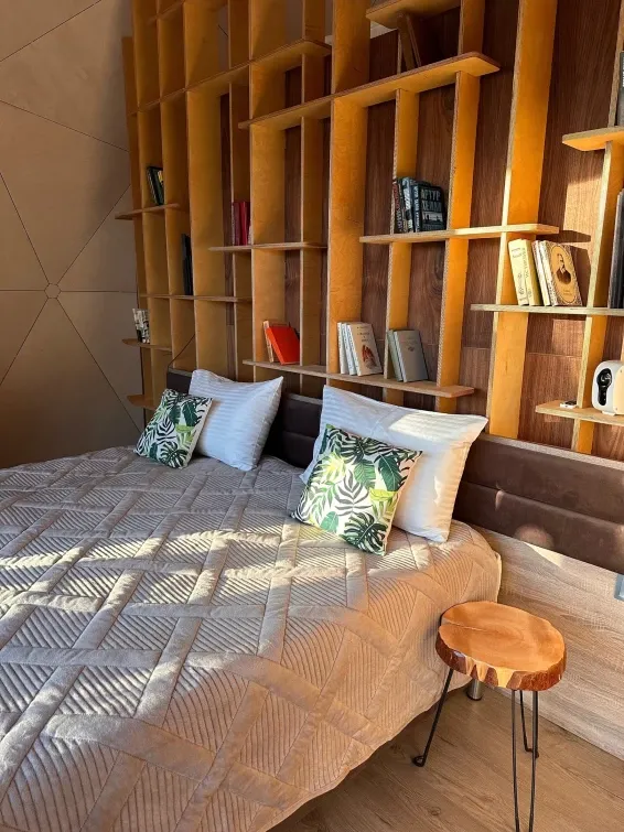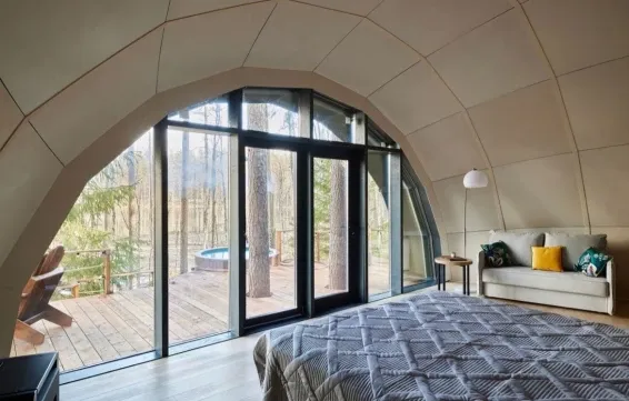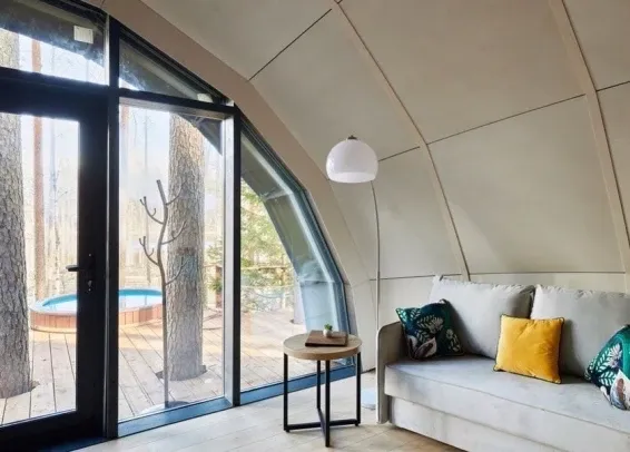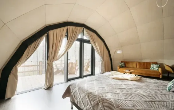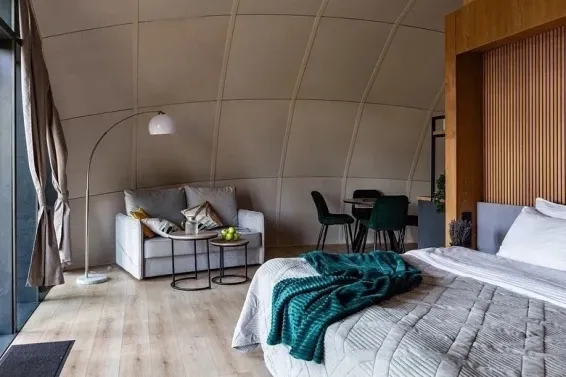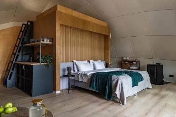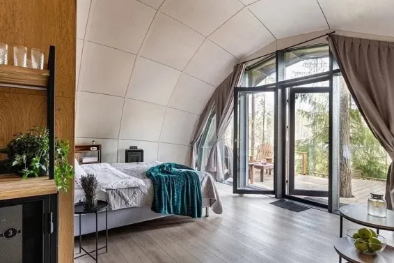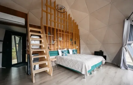 Невероятная конструкция дома в виде полусферы, уютная отделка стен деревом, которая позволяет дышать полной грудью. Панорамное окно с видом на сказочный лес и мистическое озеро. Стильный дизайн, удобная большая кровать для крепкого сна.