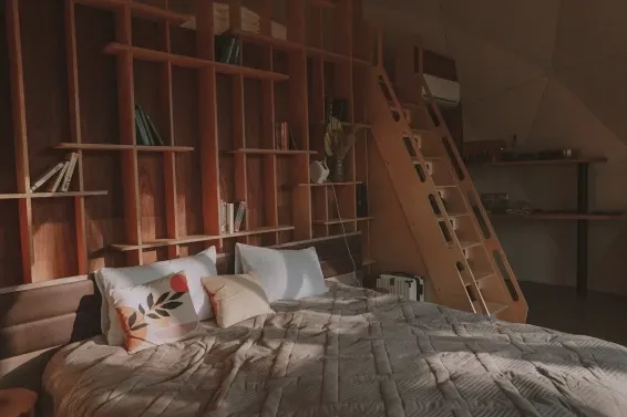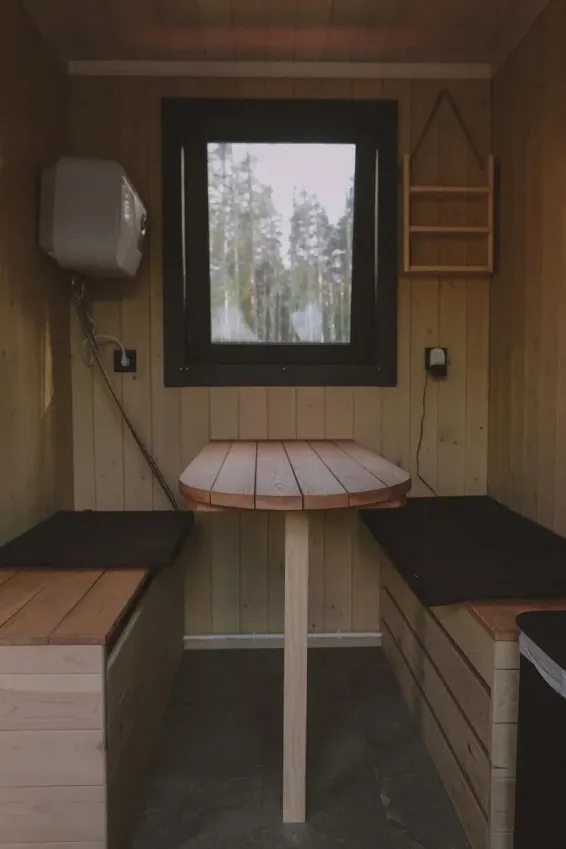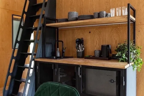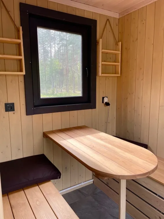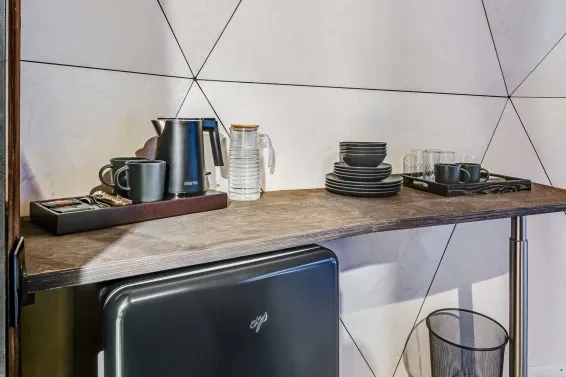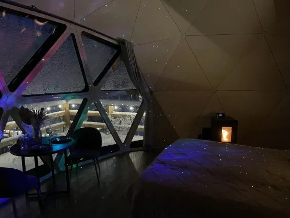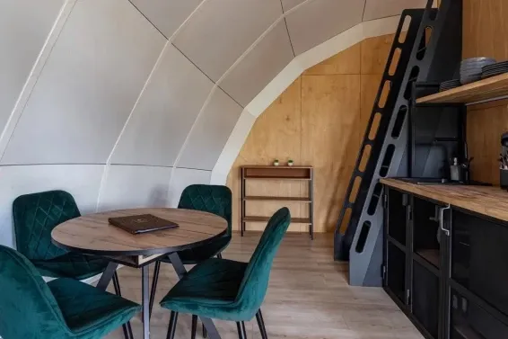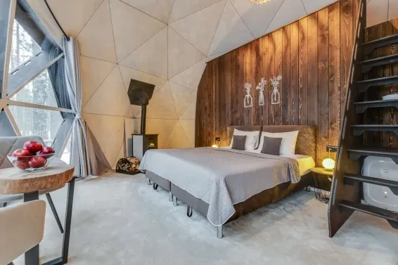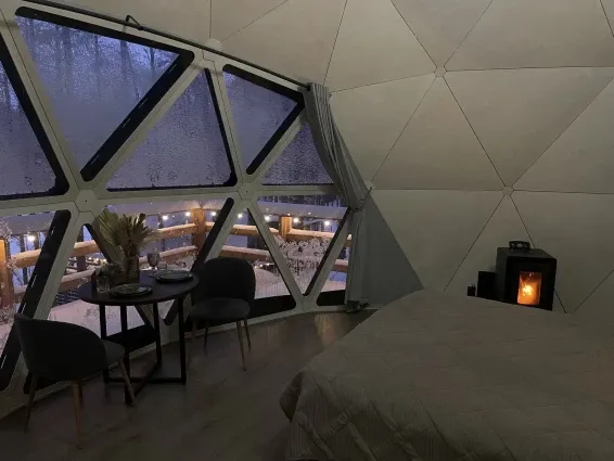 В каждой сфере есть атмосферный пеллетный камин, кондиционер, мягкие стулья у обеденного столика, два дополнительных спальных места на импровизированном втором этаже (мезанине), а в кухонной зоне чайная станция,