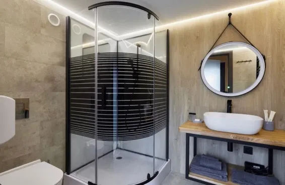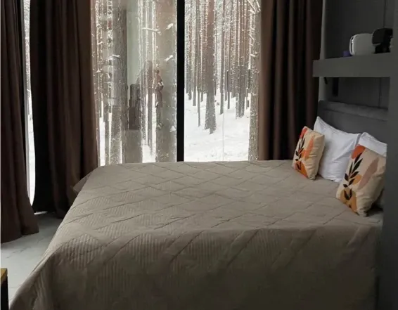 Необычная конструкция дома с панорамным остеклением в пол. Вид на сказочный лес и мистическое озеро. Стильный дизайн, удобная большая кровать для крепкого сна. Собственный санузел оснащен раковиной, душевой кабиной, феном.