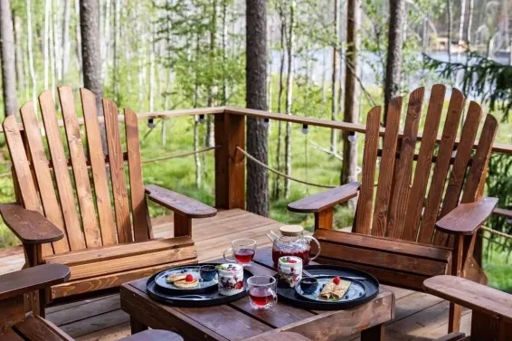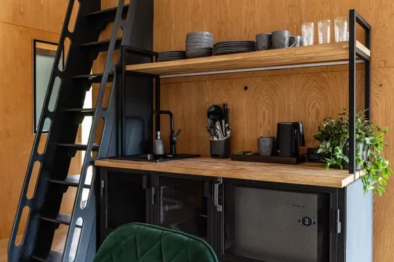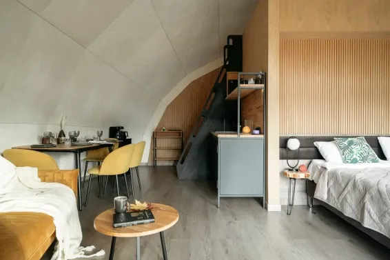 В каждом лодже есть атмосферный пеллетный камин, кондиционер, мягкие стулья у обеденного столика, раскладной двуспальный диван и два дополнительных спальных места на импровизированном втором этаже (мезанине).