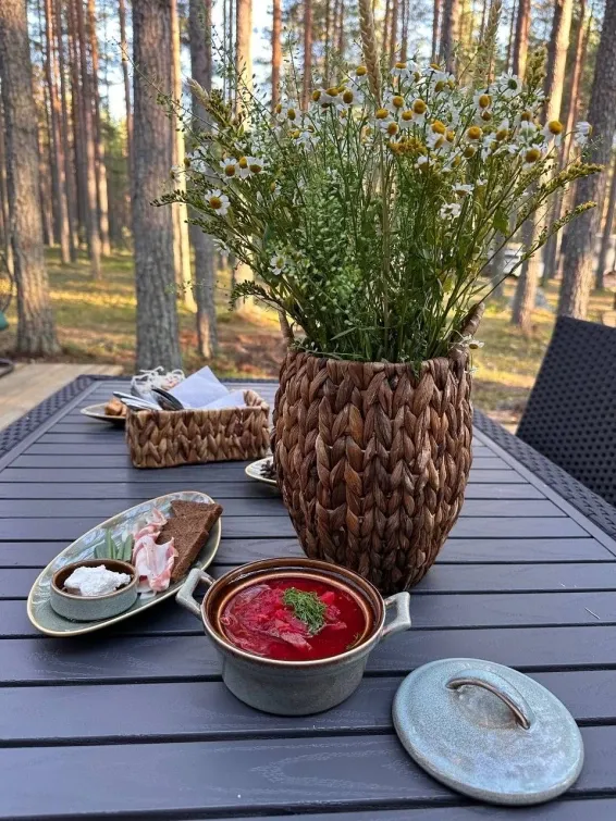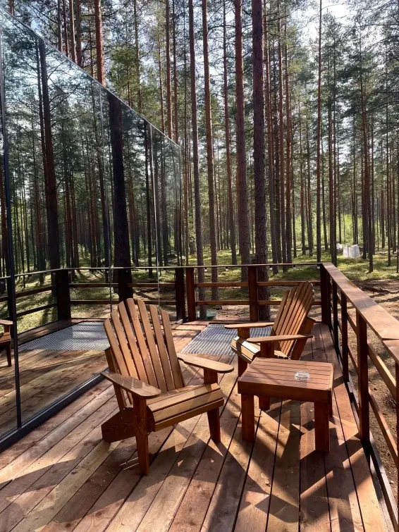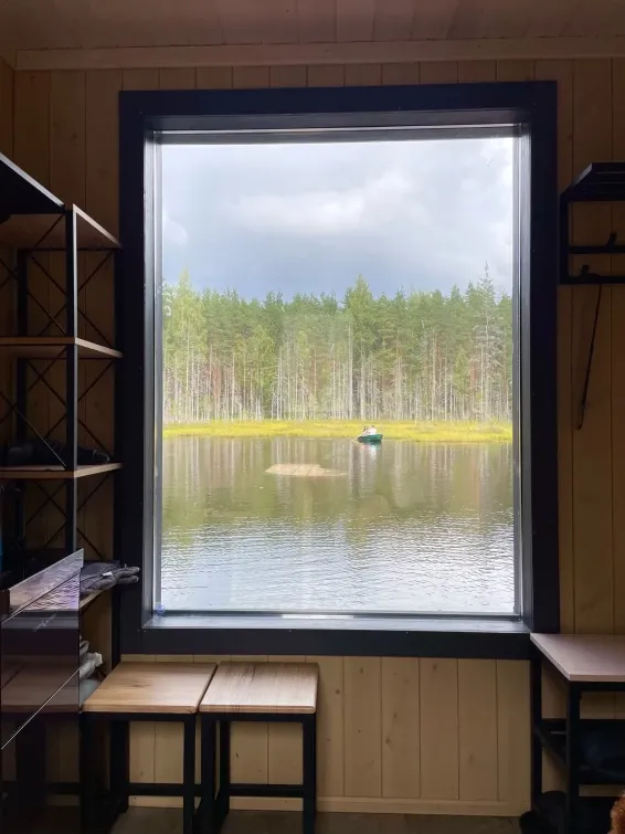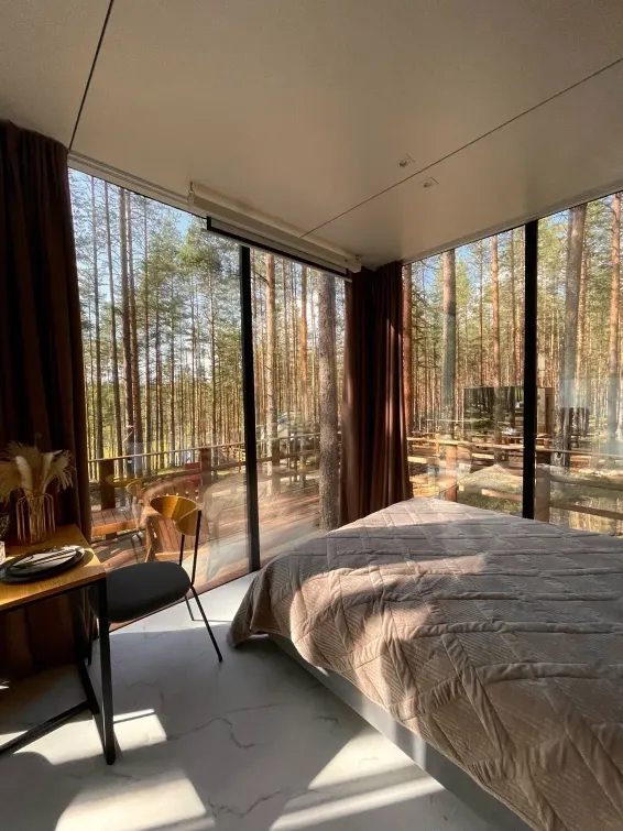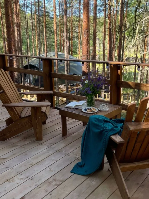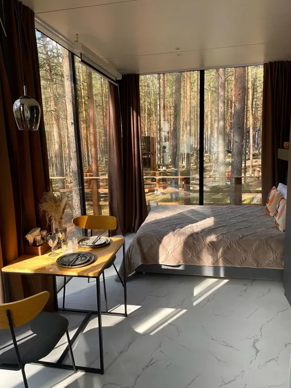 Из окон шатра открывается прекрасный вид на лес, что создает особую атмосферу уюта и спокойствия.