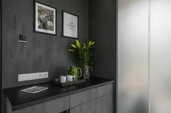 Кухонный уголок оснащен чайной станцией, мини-плитой, раковиной, мини-холодильником, набором необходимой посуды.