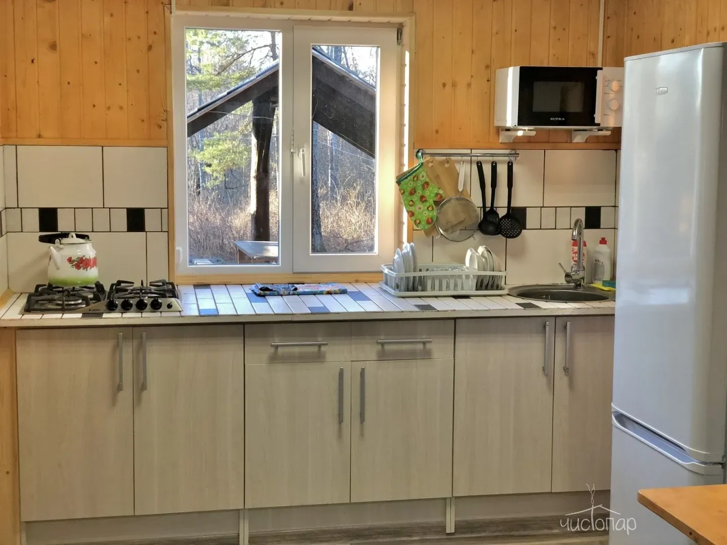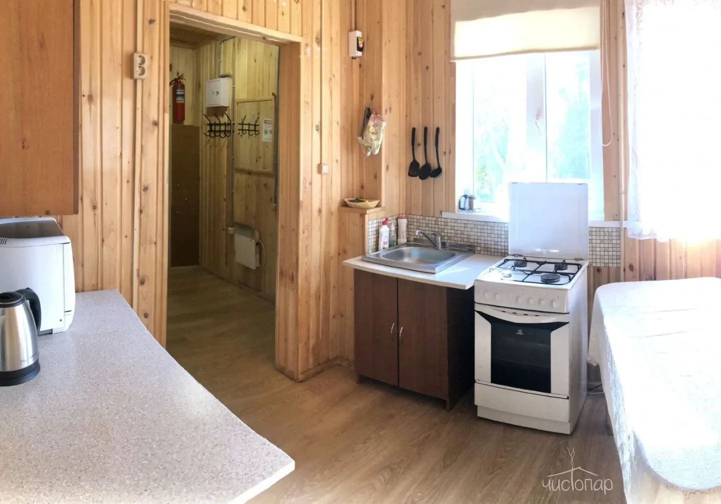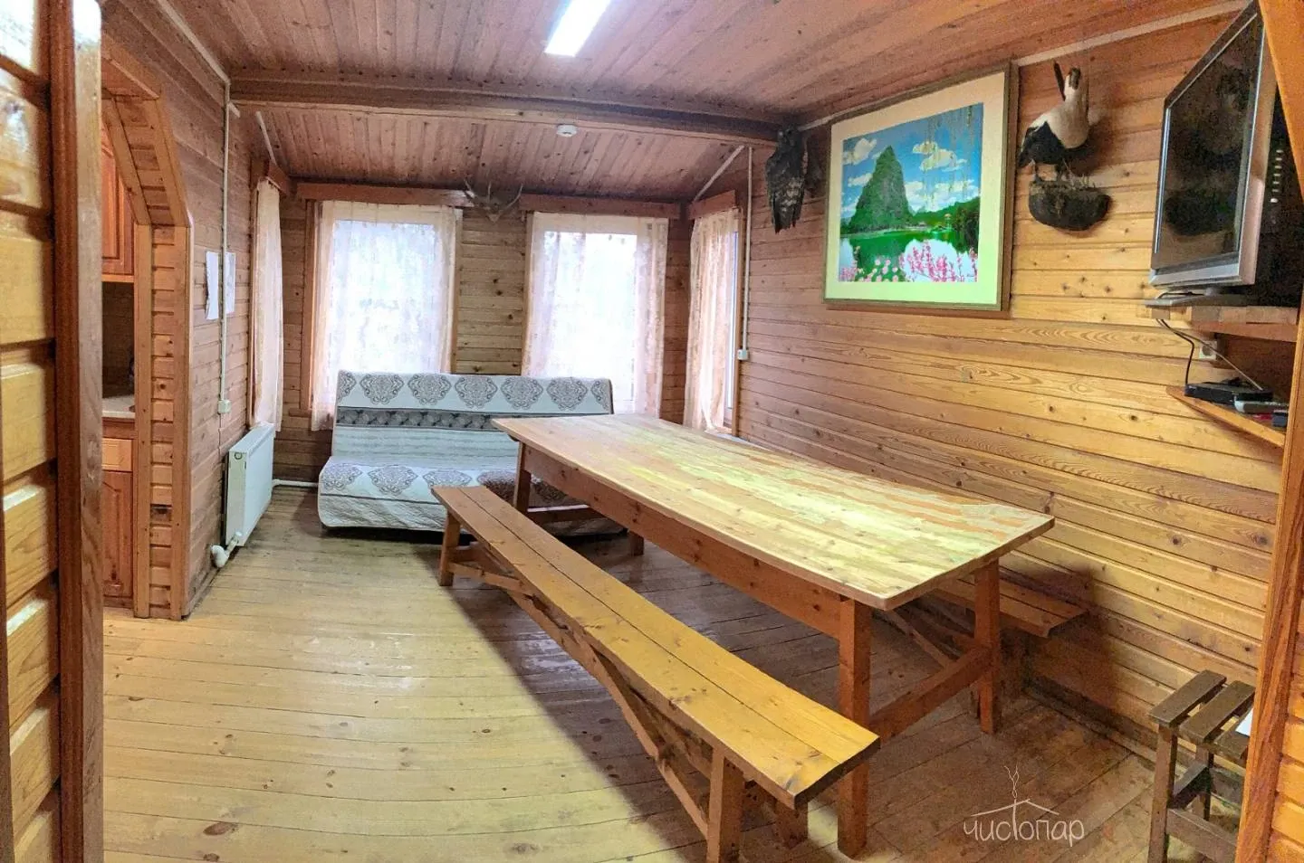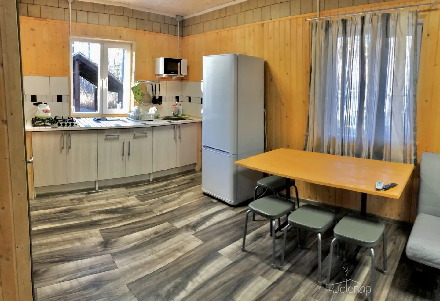 В распоряжении гостей спальная, гостиная совмещённая с кухней, санузел с душевой. Обогревание электрическое, есть холодная и горячая вода, телевизор в обеденной зоне (спутниковое), на кухне есть весь необходимый инвентарь: большой обеденный стол, посуда, микроволновка, электр.чайник, газовая плита, холодильник.