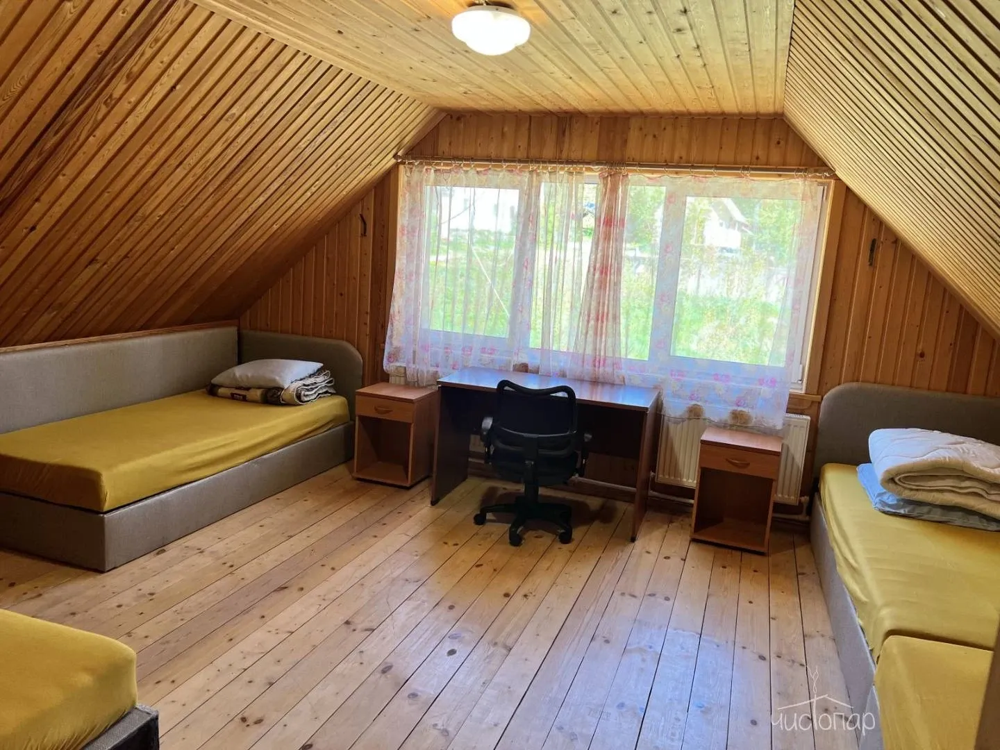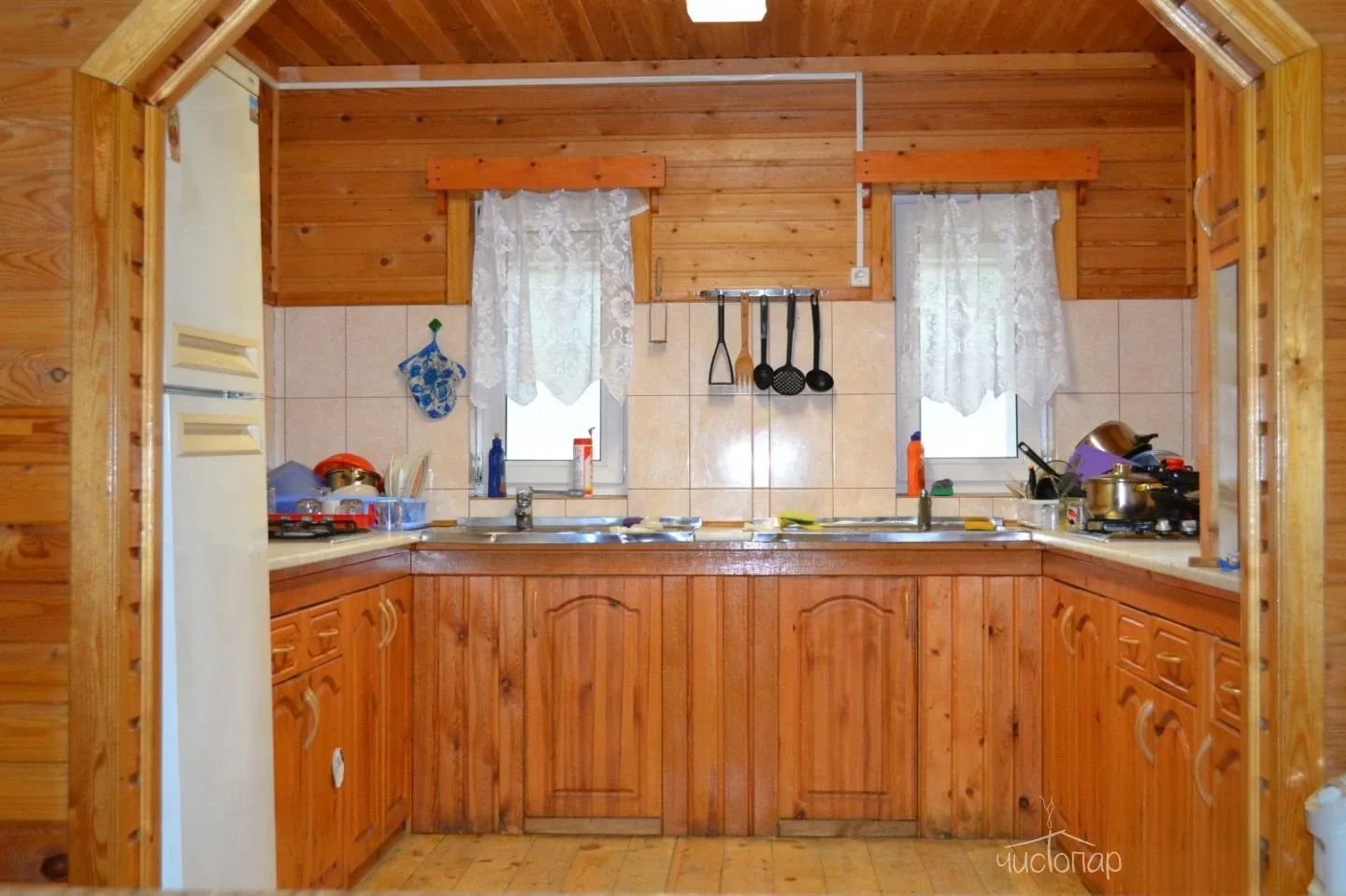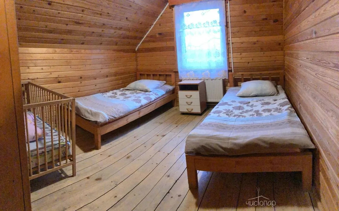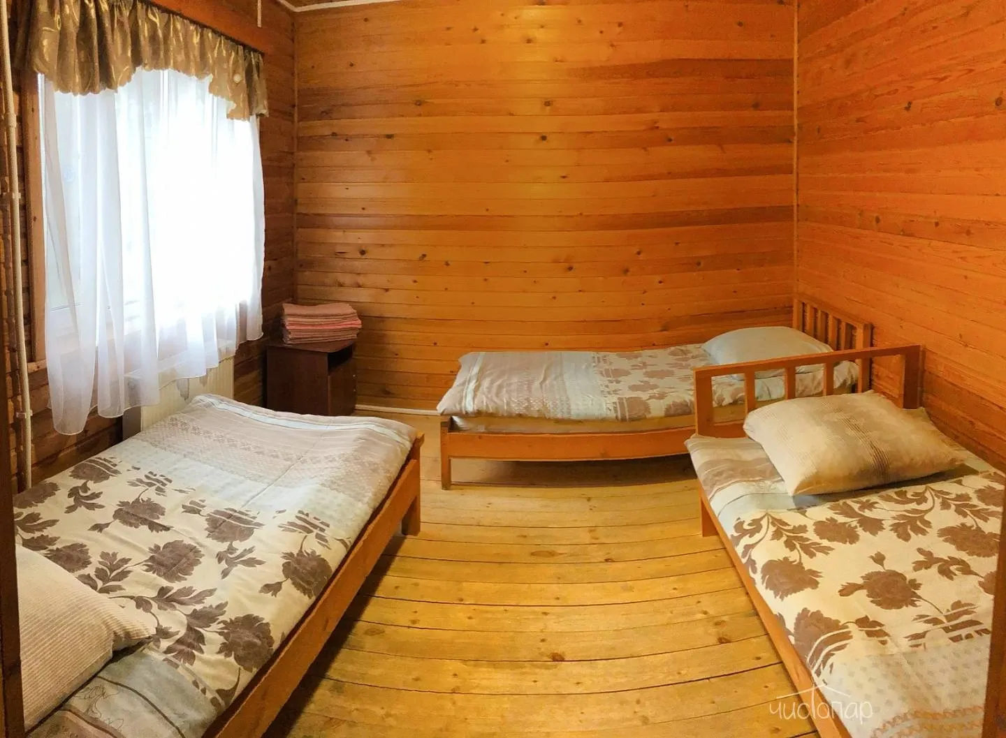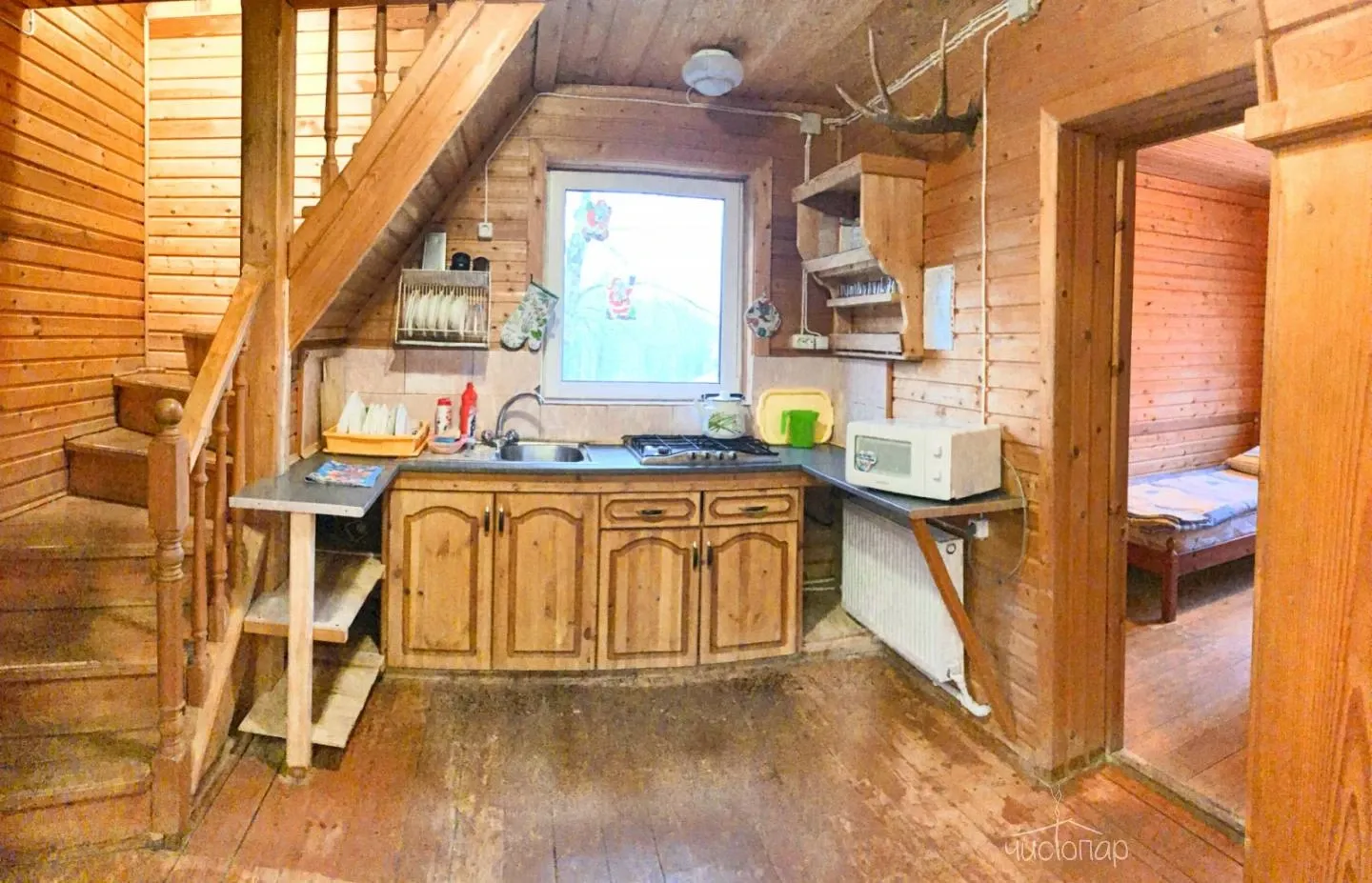 В распоряжении гостей спальная, гостиная совмещённая с кухней, санузел с душевой. Обогревание электрическое, есть холодная и горячая вода, телевизор в обеденной зоне (спутниковое), на кухне есть весь необходимый инвентарь: большой обеденный стол, посуда, микроволновка, электр.чайник, газовая плита, холодильник.