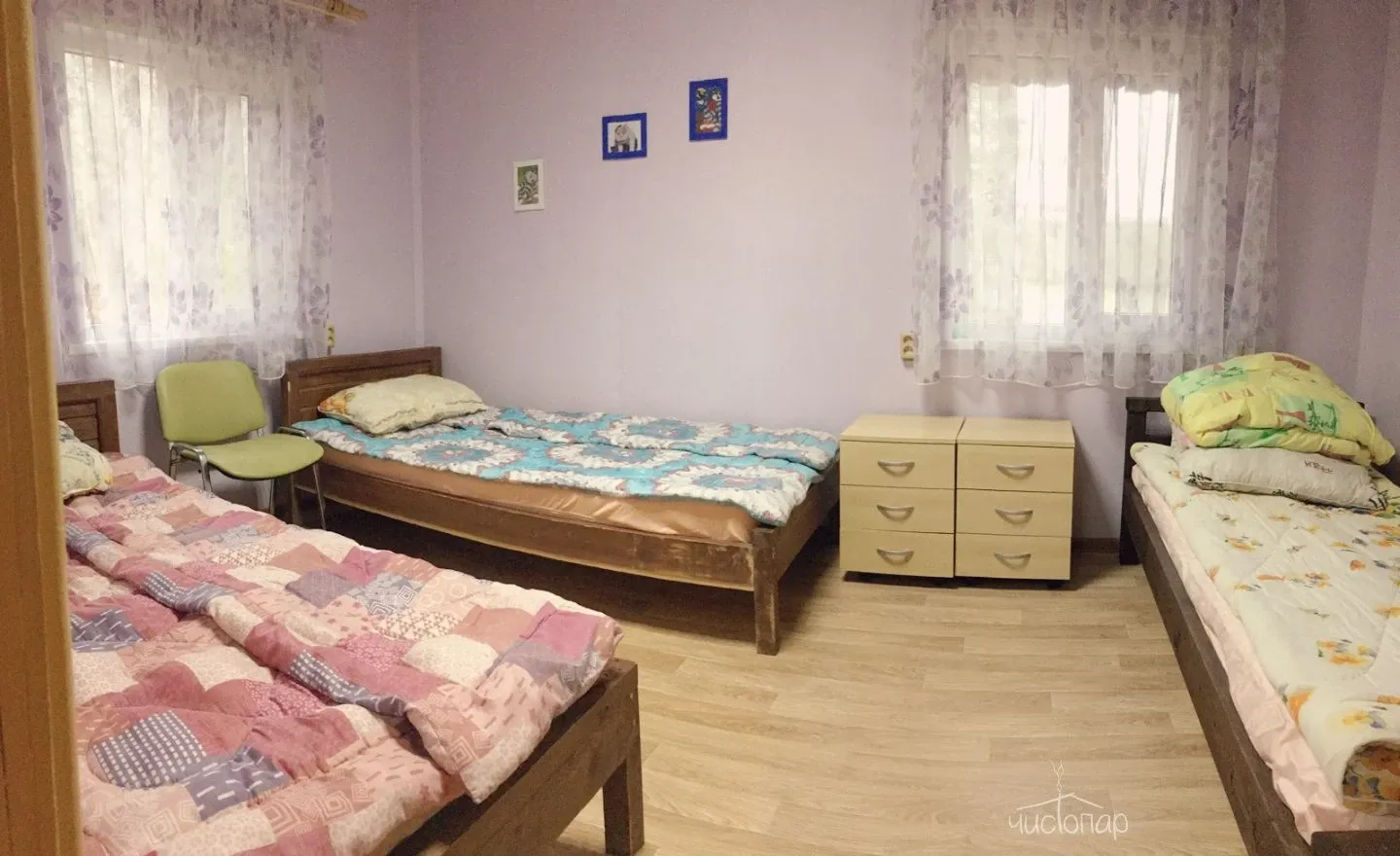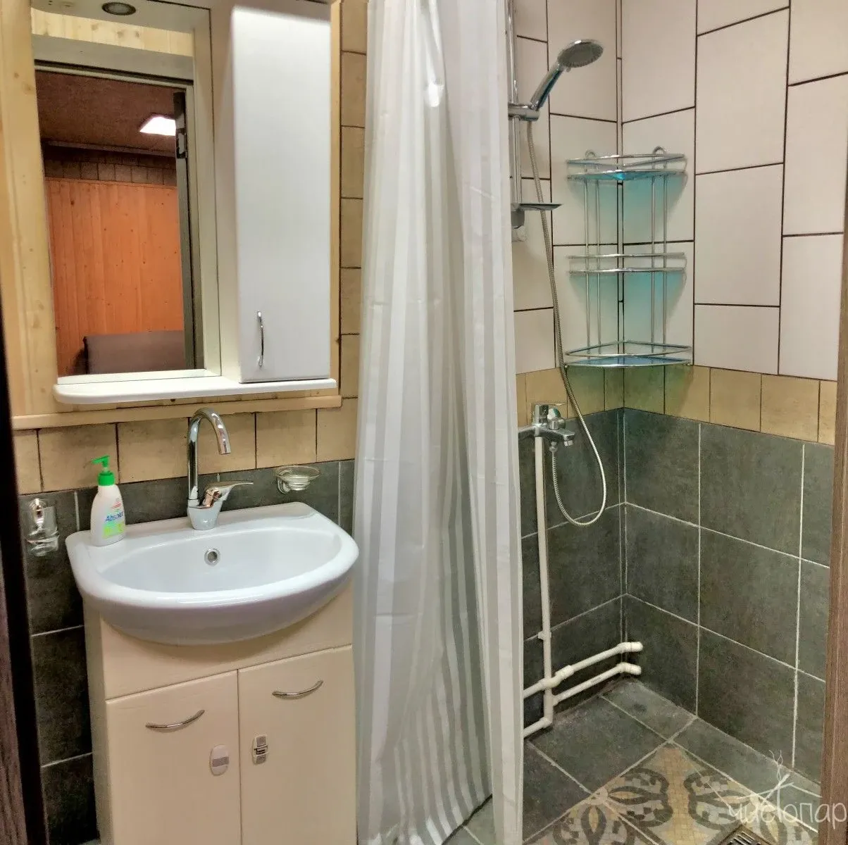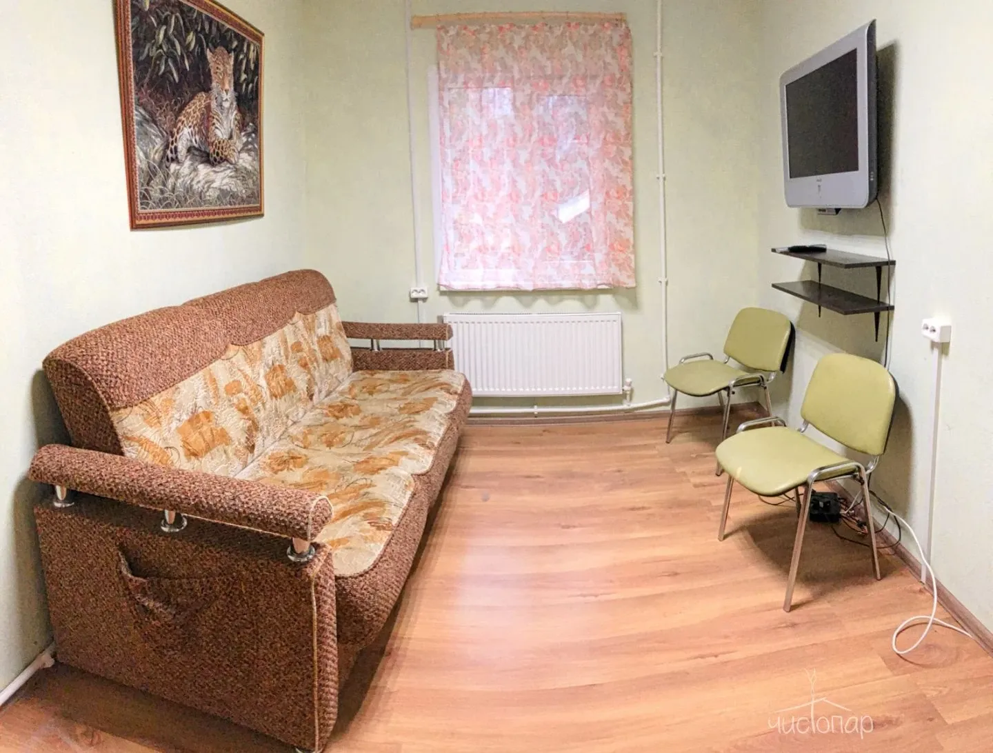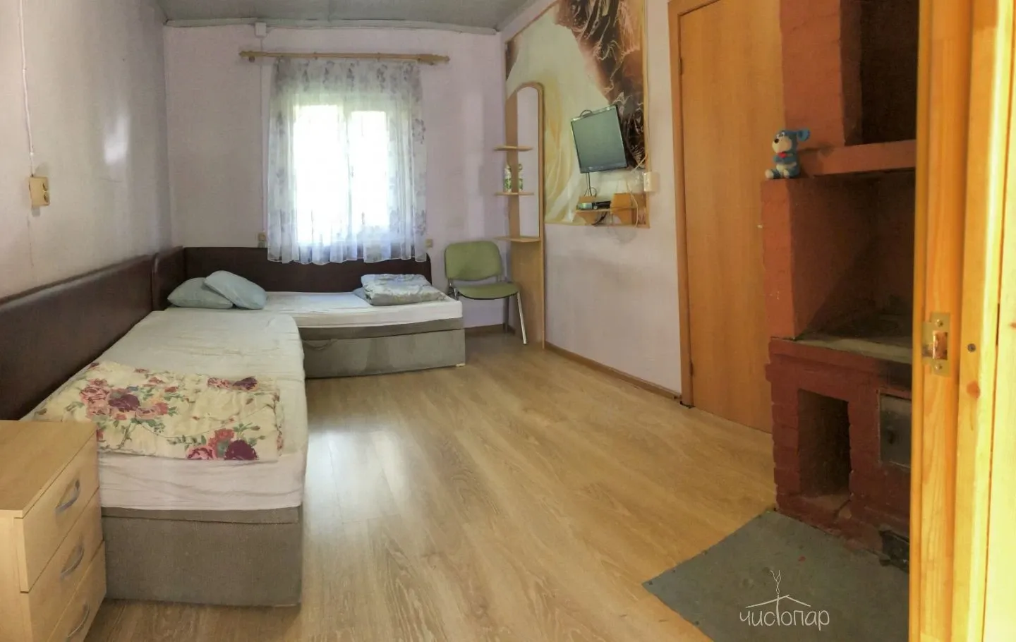 Первый этаж гостевого дома с отдельным входом рассчитан на компанию 3-4 человека, площадью 50 м кв - просторная однокомнатная квартира. В распоряжении гостей спальная, гостиная совмещённая с кухней, санузел с душевой. Обогревание электрическое, есть холодная и горячая вода, телевизор в обеденной зоне (спутниковое), на кухне есть весь необходимый инвентарь: большой обеденный стол, посуда, микроволновка, электр.чайник, газовая плита, холодильник.