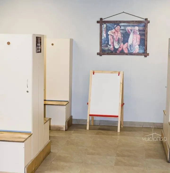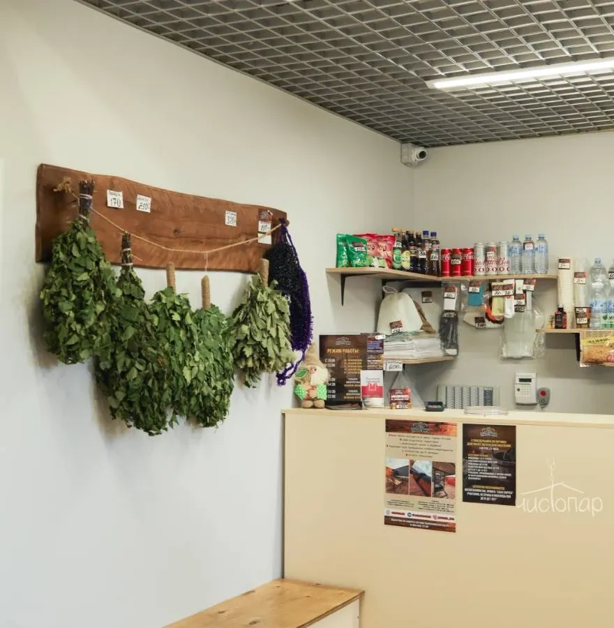 На ресепшен можно приобрести шапочки, тапочки, свежие дубовые и березовые веники, чай, кофе и снеки