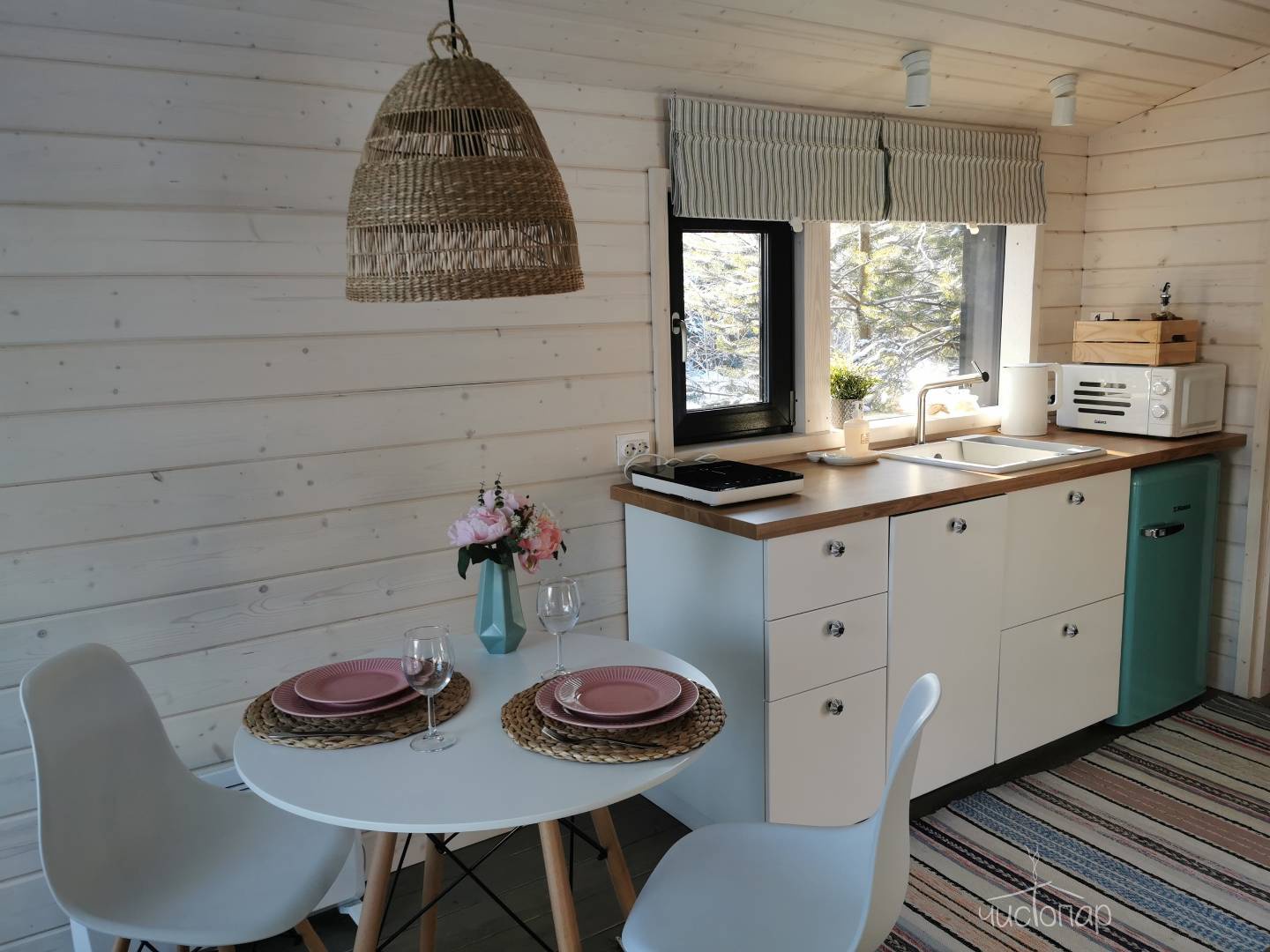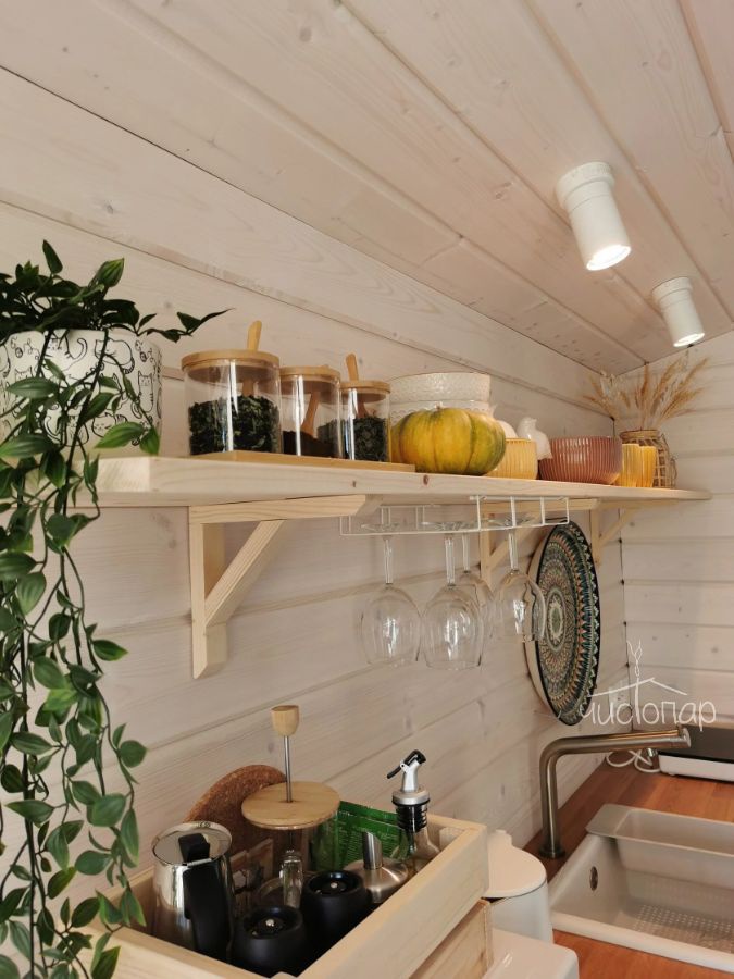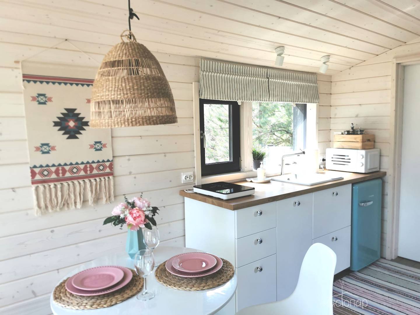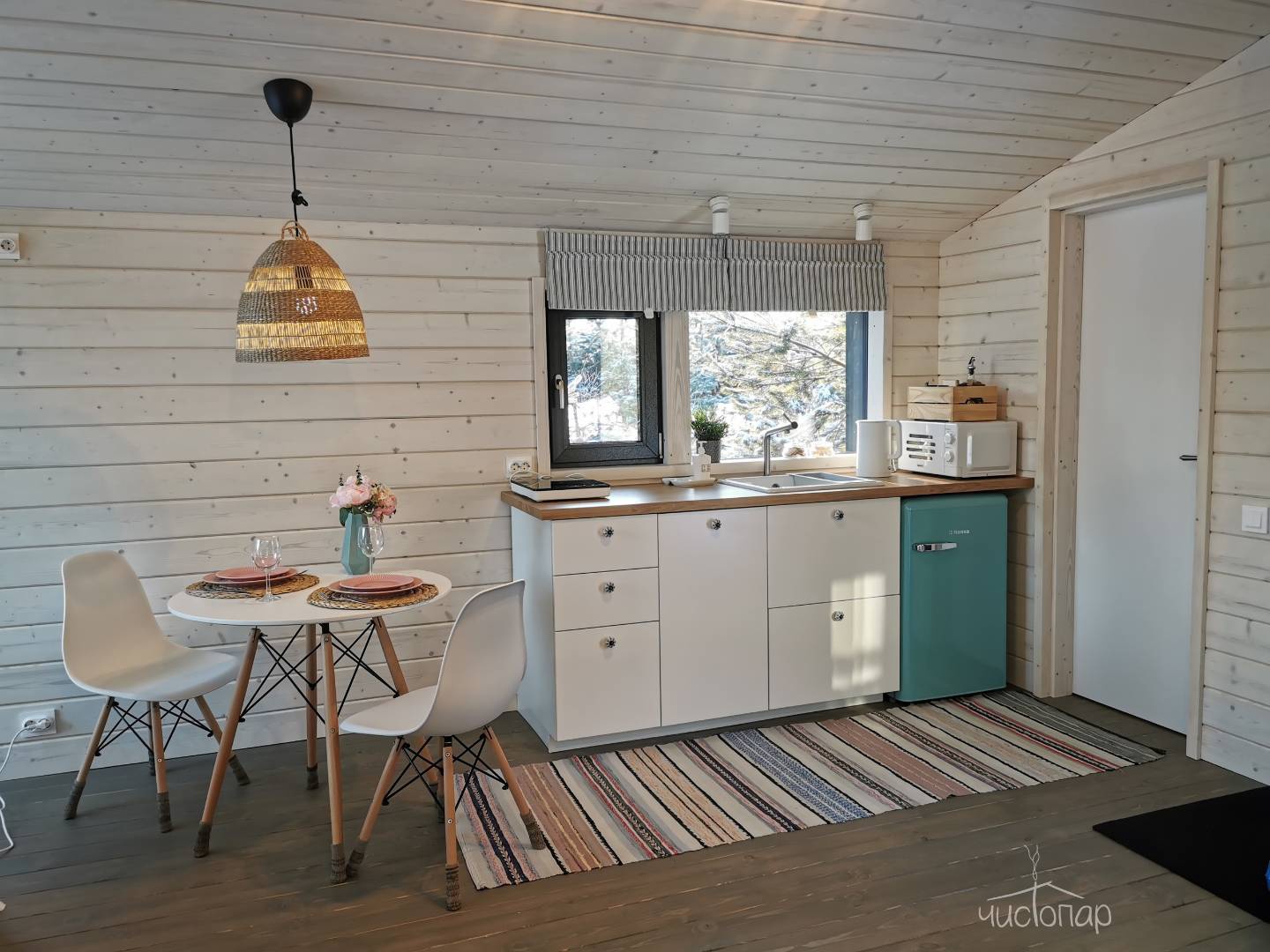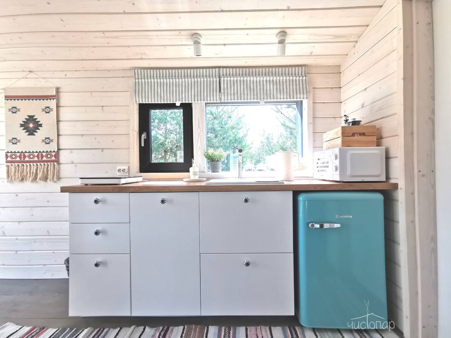 ▸ Кухонная зона полностью оборудована современной техникой, установлен инверторный кондиционер, который работает как тепловой насос с функцией как охлаждения, так и отопления.