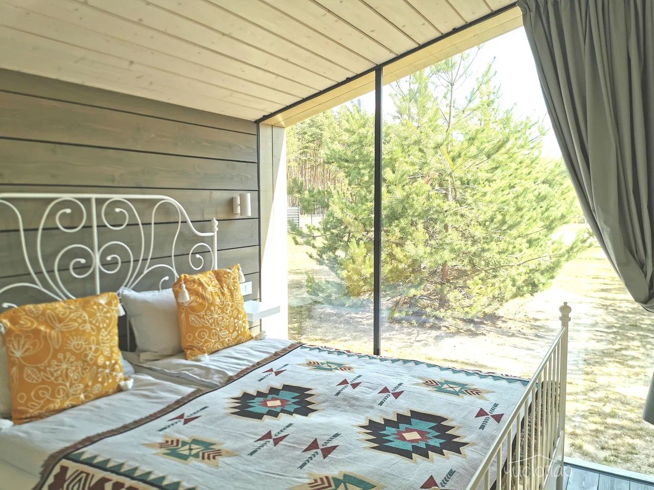 ▸ В спальне с панорамным окном установлена красивая кровать. Шторы блэкаут и ортопедический матрас высотой 24 см позволят хорошо выспаться.