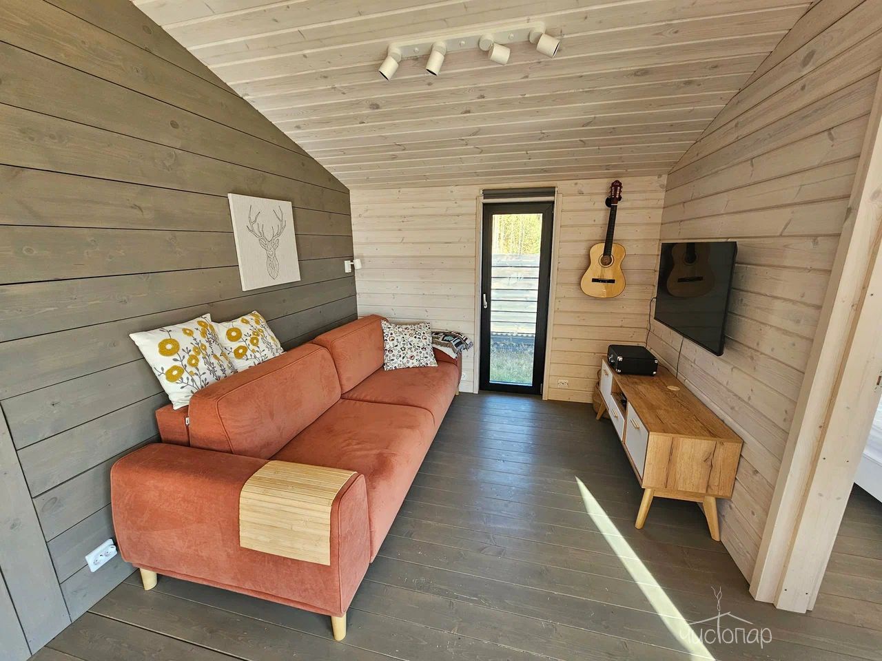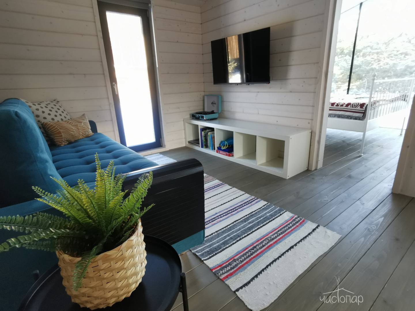 ▸ В гостиной есть раскладной диван. Телевизор c эфирным телевидением, SmartTV и подпиской Ökko. Виниловый проигрыватель с коллекцией пластинок, настольные игры и небольшая библиотека.